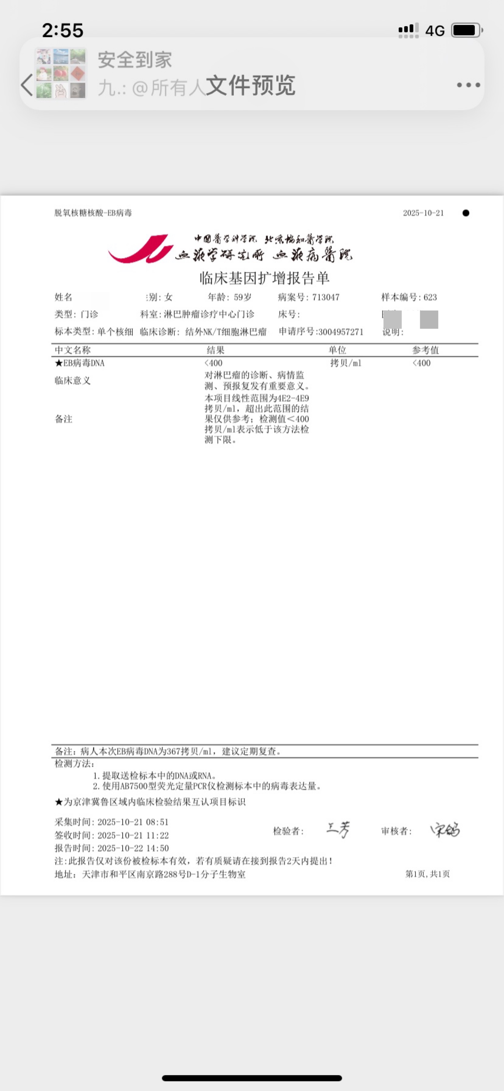 老妈23年8月确诊nkt,23年10月20日中期petCR,23年10月底第四次化疗结疗,23年12月25日至24年1月25日放疗结疗,结疗后5个月发现eb复阳(除了eb其余指标都很正常),血浆阴,单个核阳,分选nk阳性,每几个月复查一次,一直未转阴,虽然载量不高,但是始终提心吊胆!