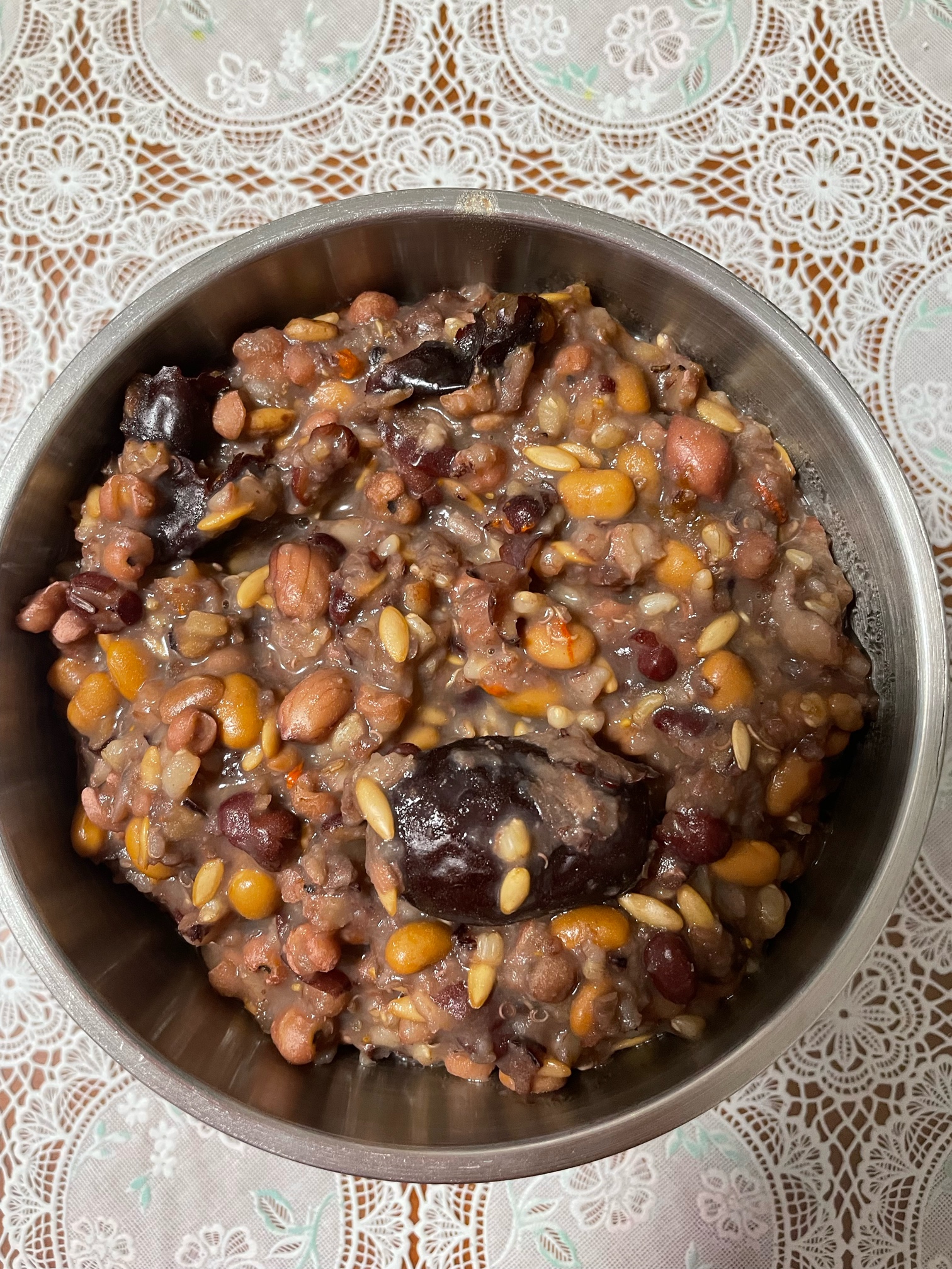 粥:红皮花生米、花生衣、红豆、糙米、炒薏米、黄豆、西洋参、桂圆、红枣、枸杞、白芸豆、黃瓜籽粉、杂粮(今天由于放了杂粮,水放少了)