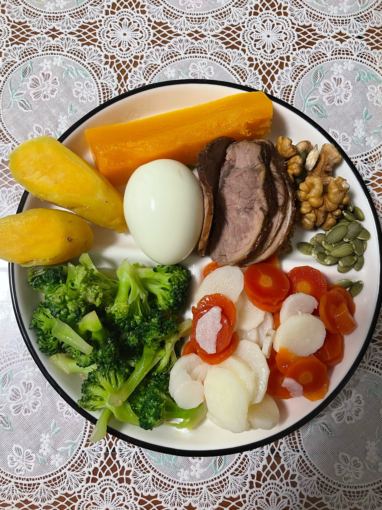 酱牛肉、鸡蛋、核桃仁、南瓜子、西兰花、水果胡萝卜、山药、密薯、瓜