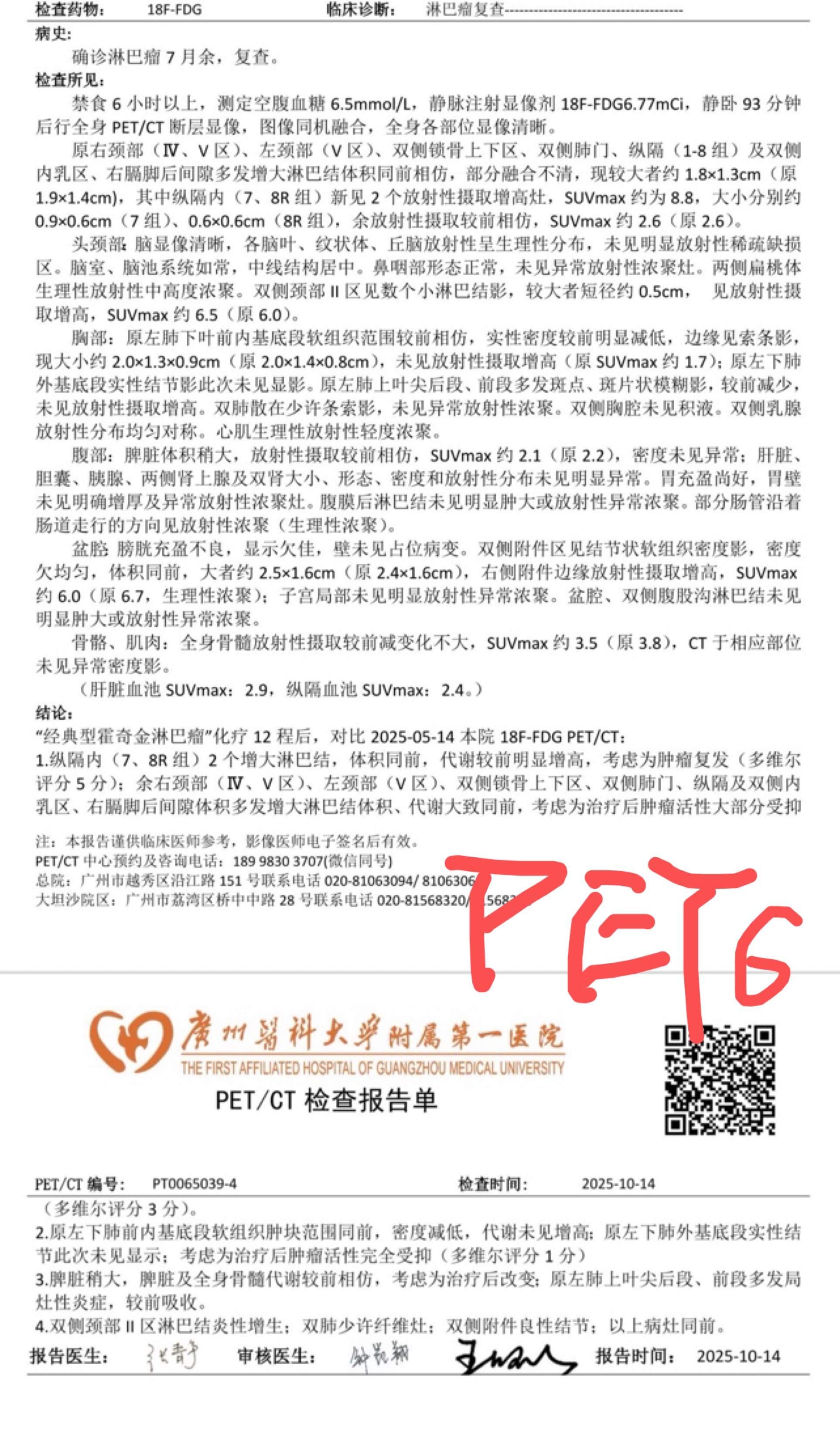 10月14日,6疗完成后一个半月的pet显示“其中纵隔7、8R区新见2个摄取增高灶,suvmax 约8.8”评分5分。