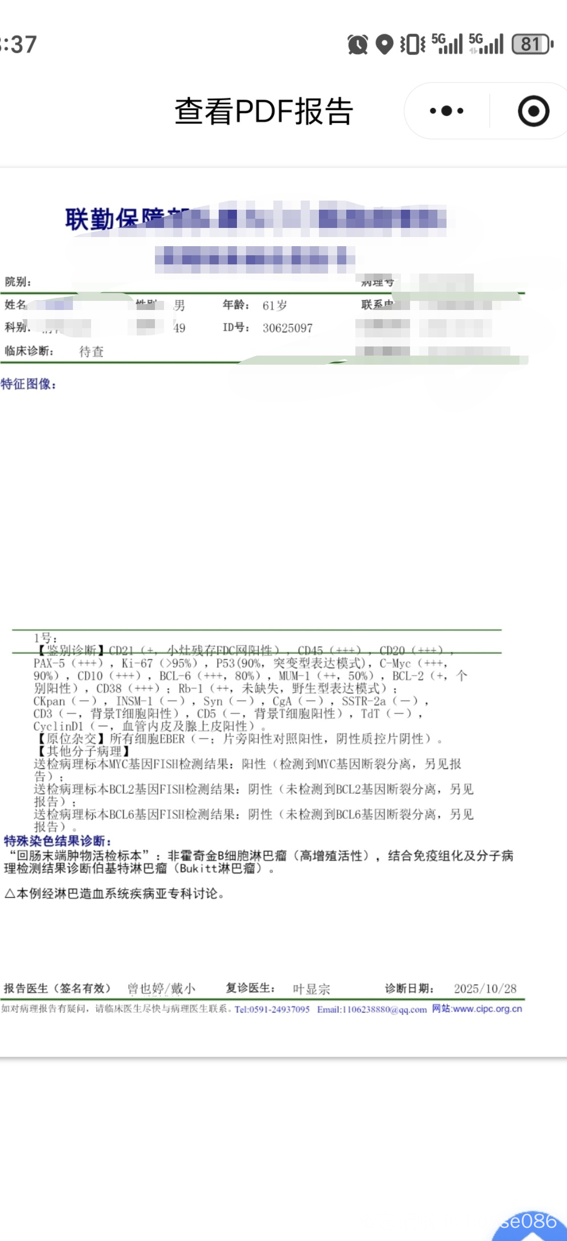 橙色雨丝 发表于 2025-11-07 15:39 DA-EPOCH-R+鞘注只适合于CNS侵犯风险低的伯基特淋巴瘤,此例似乎不属于这种情况,恐怕需要考虑例如R-HyperCVAD/MA这样的高强方案。