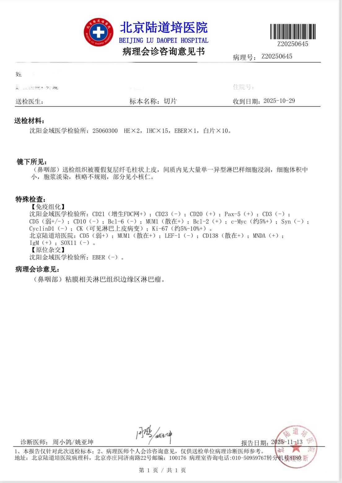 确诊病理会诊之路——谢谢淋巴瘤之家的病理服务