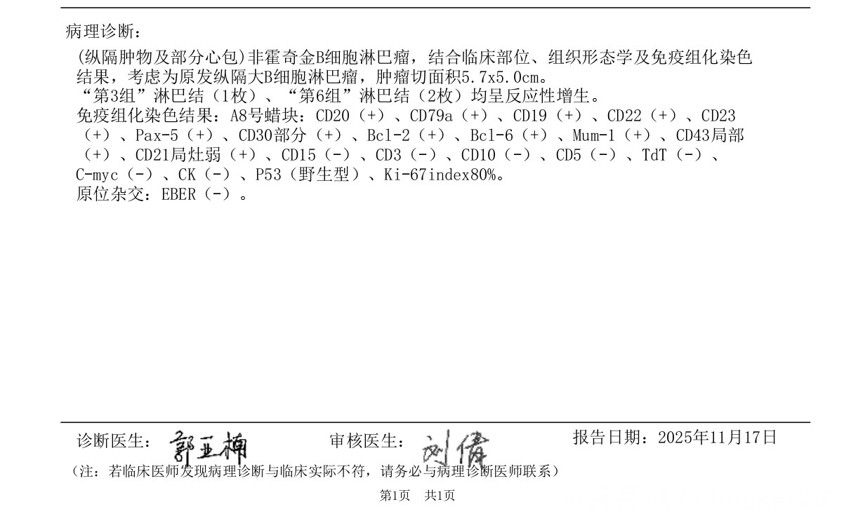 十月底单位组织体检,CT发现纵膈肿物5.0,一周后去省立医院检查,做了加强CT,考虑胸腺瘤,医生说要手术,本月初入院做了胸腔镜还切了部分心包,周一病理出结果,是淋巴瘤不是胸腺瘤,现在术后一周在家休养,想问问这种情况术后什么时候可以开始下一步的治疗?@橙色雨丝 麻烦大神帮忙看看