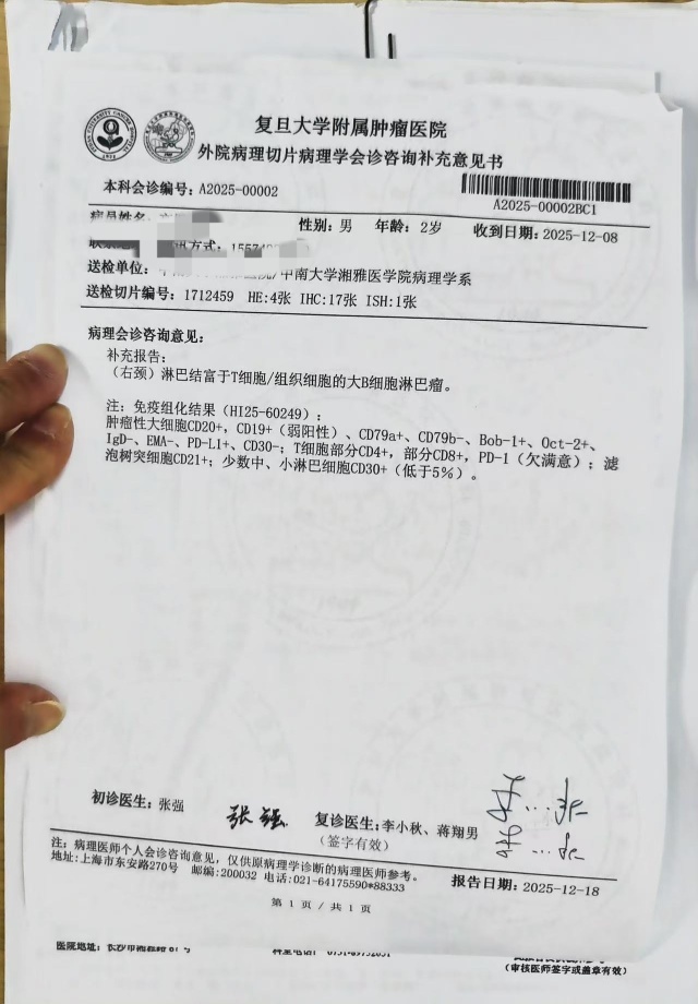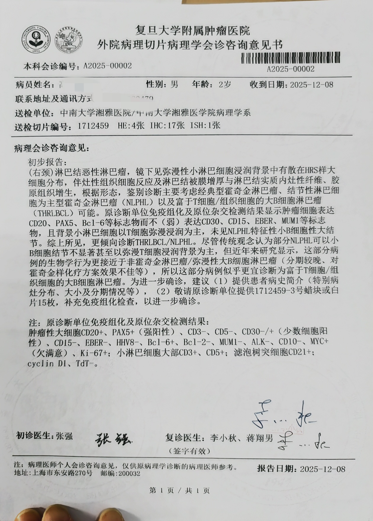 1)已经明确是淋巴瘤,这一点没有疑问;2)在霍奇金和非霍奇金之间,结合年龄,影像学检查,以及多次的病理,倾向于是非霍奇金淋巴瘤中的富于T细胞/组织细胞大B细胞淋巴瘤;3)在新的分类系统中,原来的结节性淋巴细胞为主霍奇金已经被重新命名为结节性淋巴细胞为主B细胞淋巴瘤,并且认为这种疾病与富于T细胞/组织细胞大B细胞淋巴瘤是同一种疾病的不同发展阶段,前者可以转化为后者,两者之间没有绝对的分界线;4)儿童非霍奇金淋巴瘤有成熟的治疗方案,儿童血液科医生都知道该怎么做,如果非要再进一步确认病理,只能做二代测序,结合二代测序的结果再做判断,但那样会耽误治疗。 |