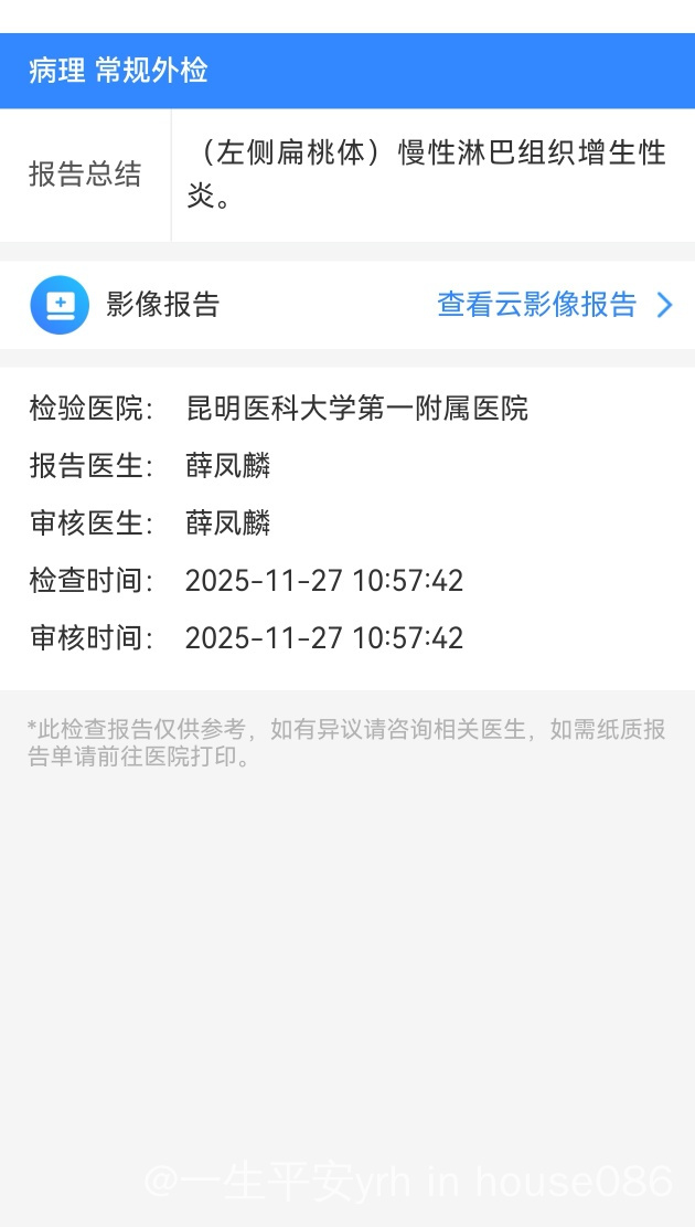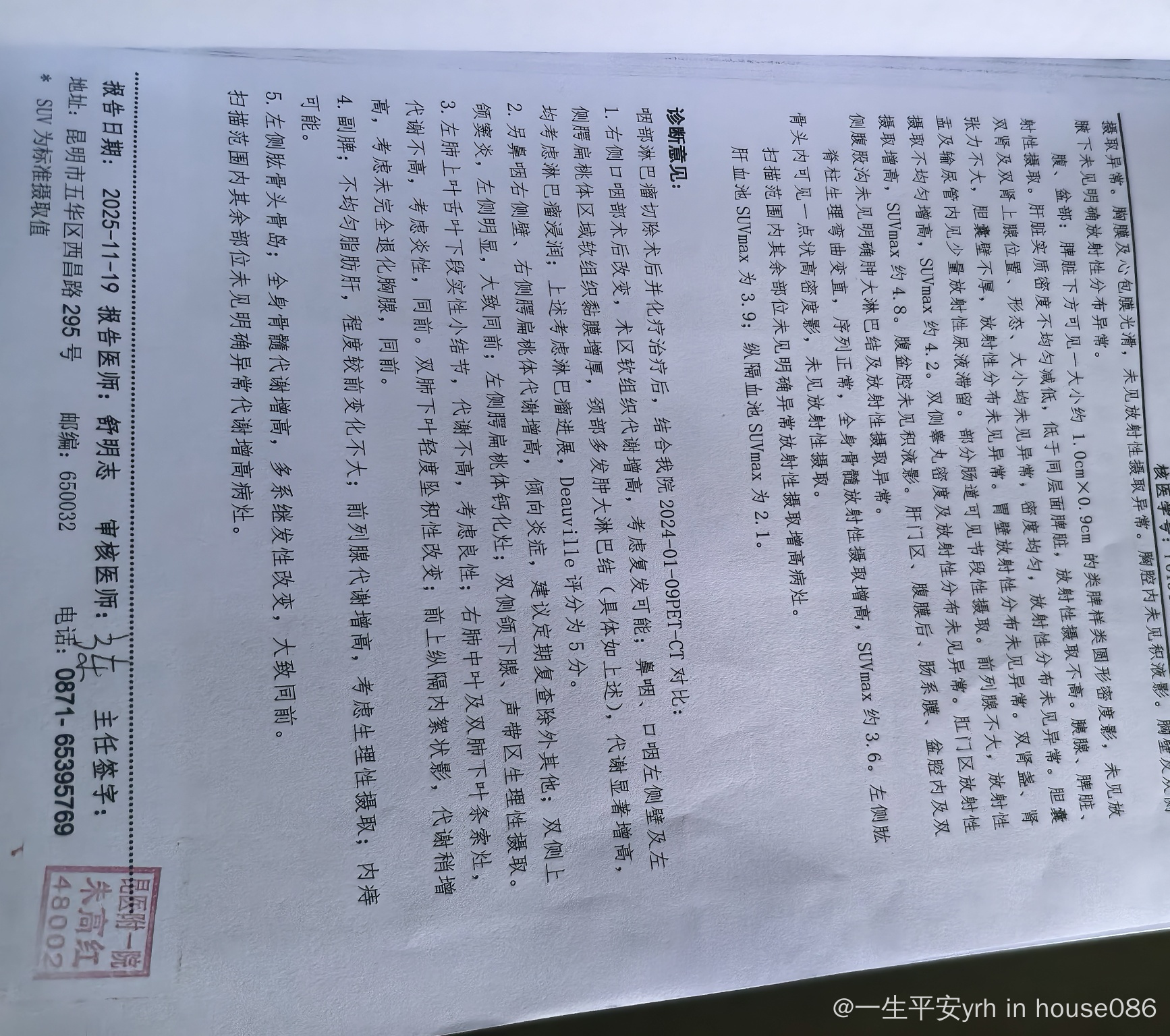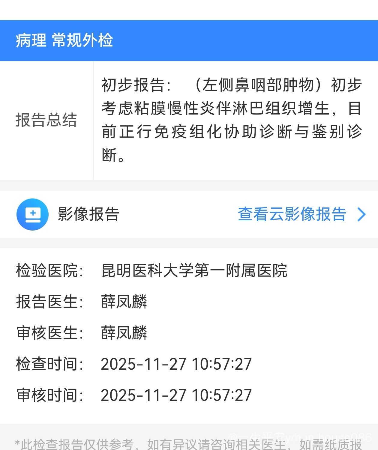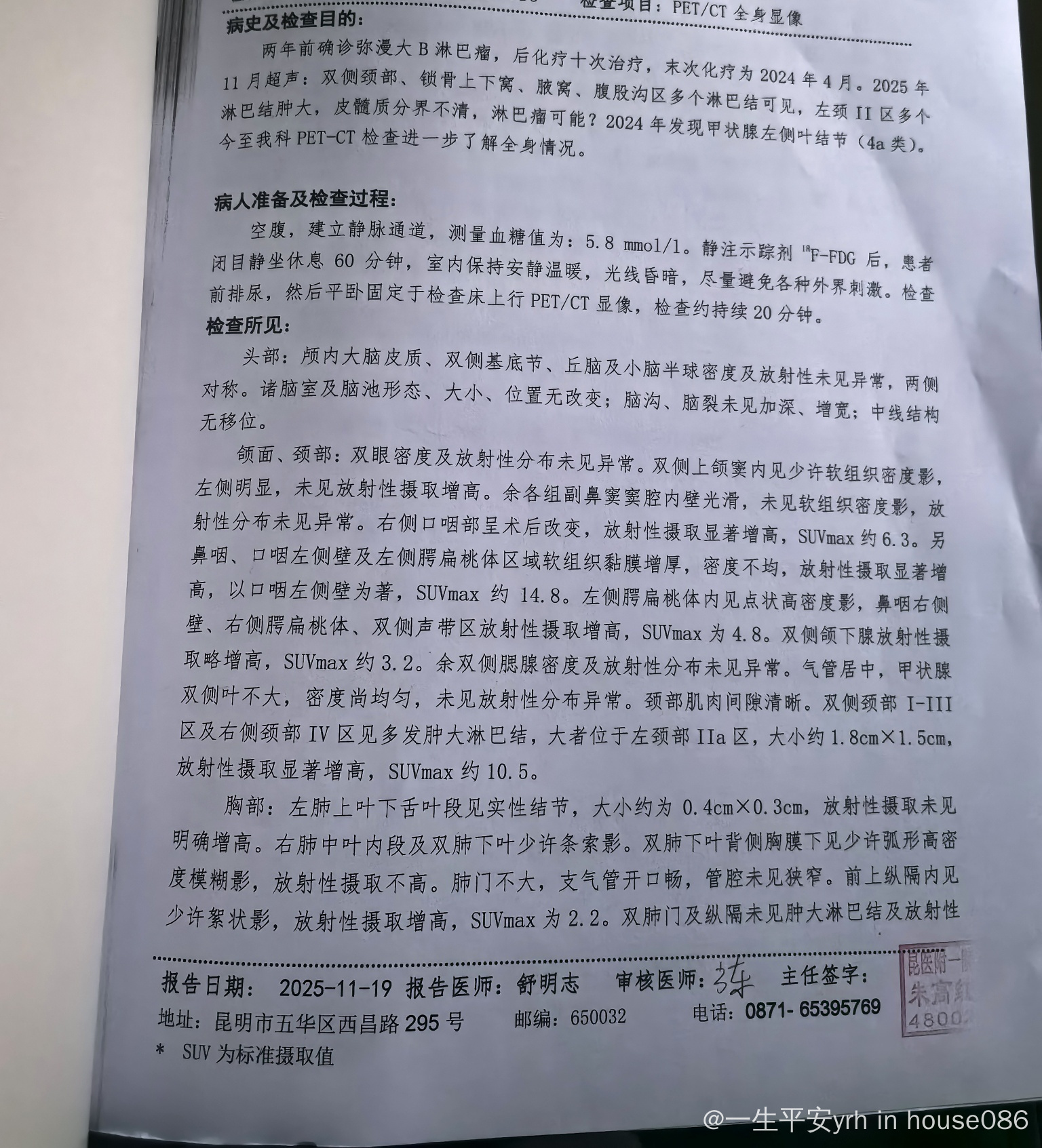 11月超声提示淋巴结不好,月底又做了PET提示淋巴瘤五分复发,取了三处病理活检,扁桃体也割了,今天报告出来提示良性,感谢菩萨,感谢妈祖,小红书许过愿,翻盘了