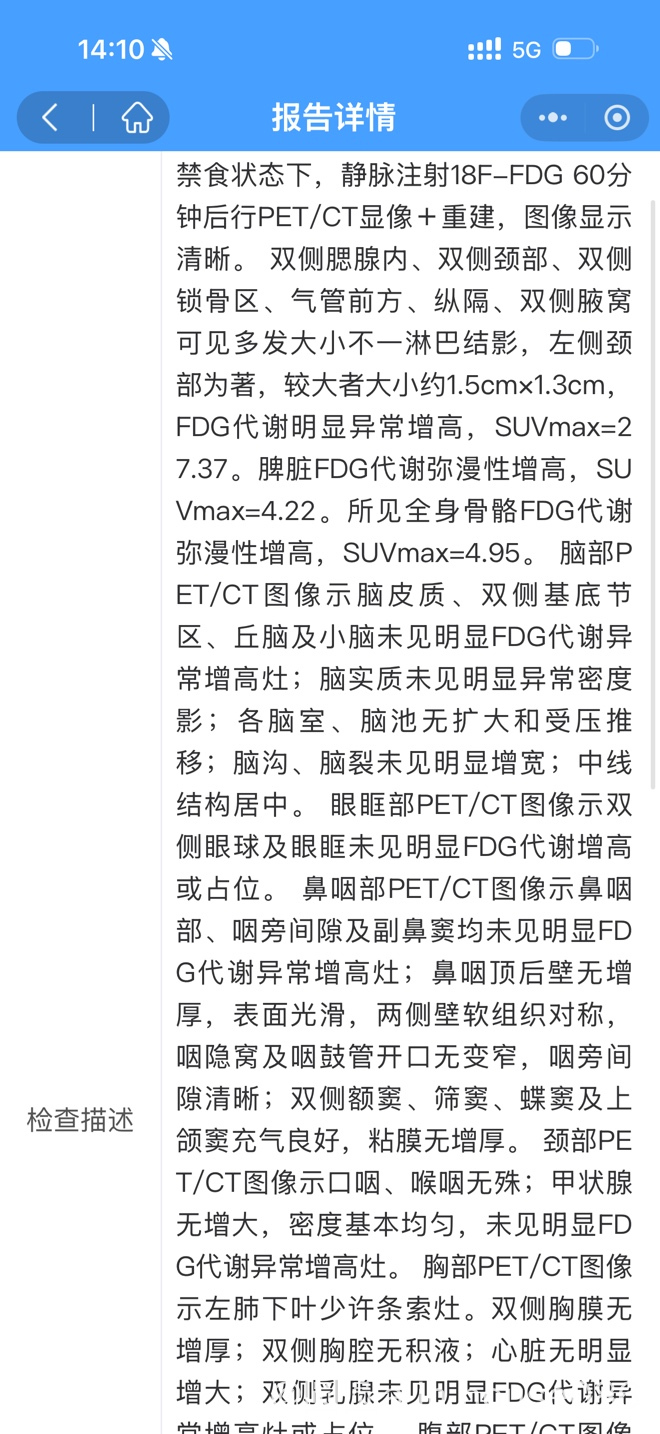 11.7后面又开始高烧,最高39.9,又做了彩超,淋巴结结构好像不好,做了petCT指标也不好穿刺大病理翻盘了是坏死性淋巴结炎。吃了二十天激素淋巴结消失了,但从昨天开始又发无症状高烧,最高39度,并且今早淋巴结肿大了些。医生说可能是细菌感染如果挂头孢不退烧就得取整个活检我这个淋巴瘤概率大吗