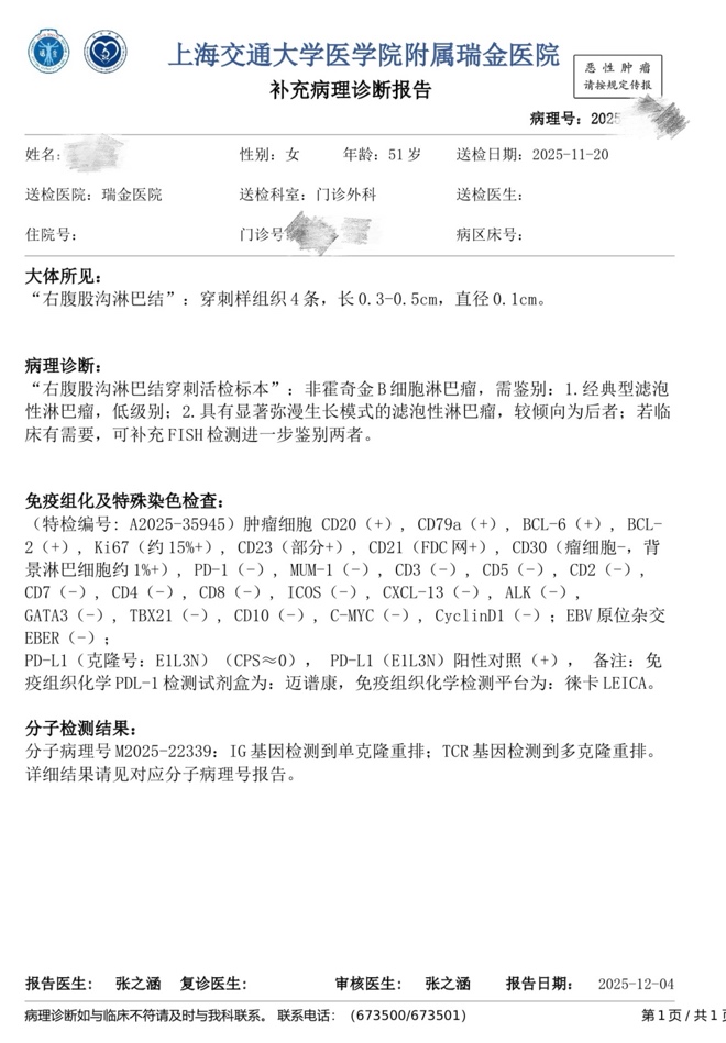 2、弥漫性增长的滤泡一般都局限在腹股沟和腋下(你的病理穿刺部位看起来也符合),一般都是低分期的,指南认为这种滤泡整体预后更好