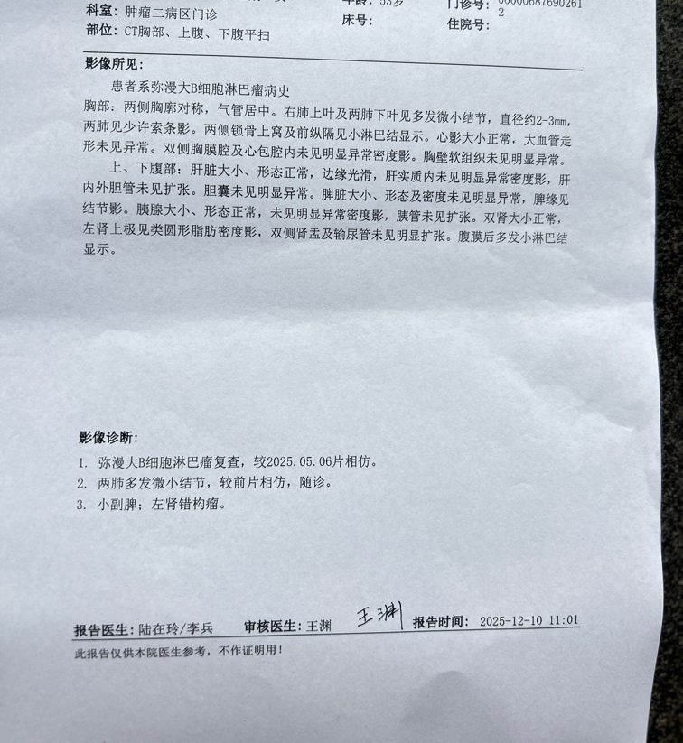 这个要和你们结疗前和服用奥布替尼时的检查报告对比看淋巴结的变化,是多了少了还是大了小了,是进展了还是好转了啥的
