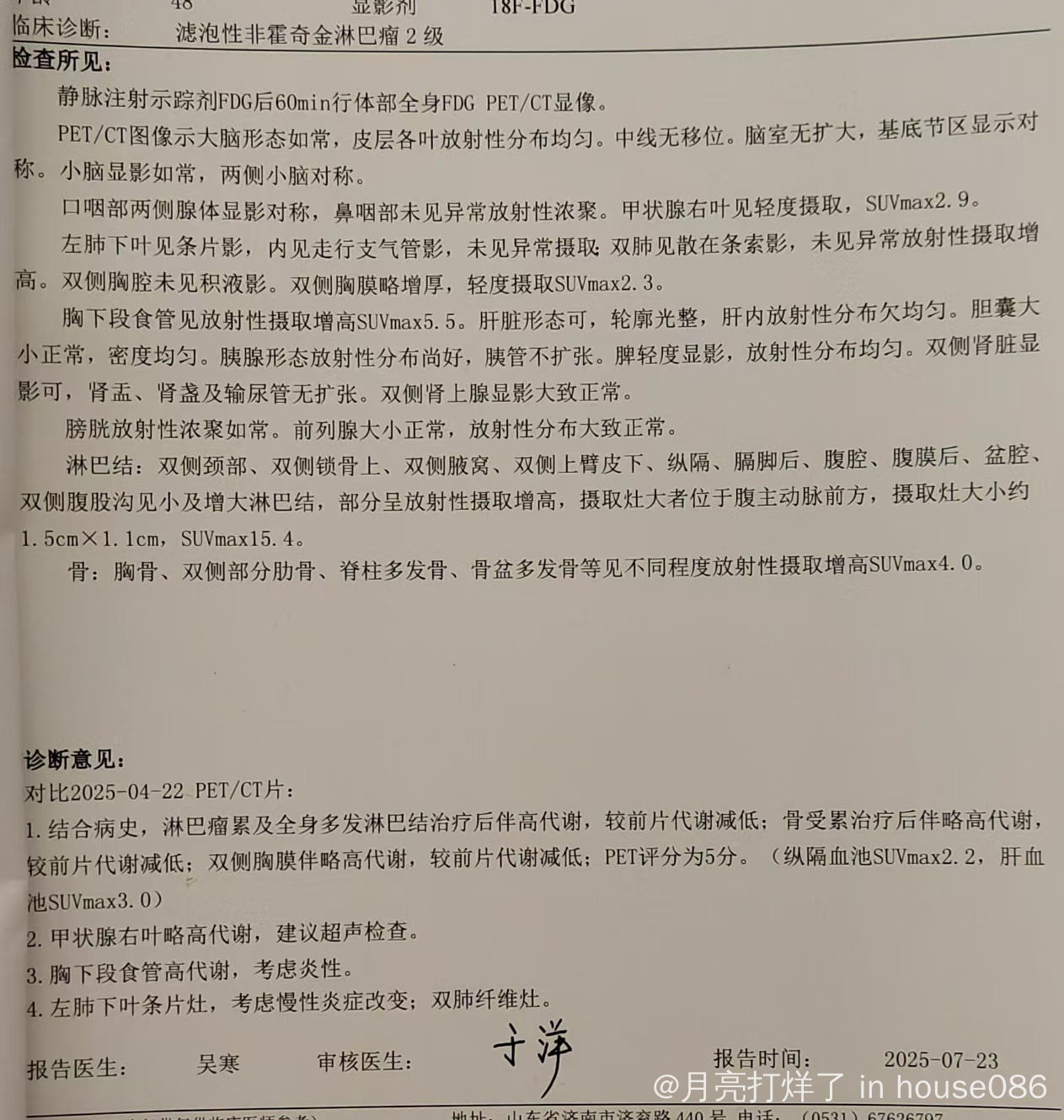 最后一张PET里面SUVmax达到17,不排除已经发生了大B转化,不建议用苯达方案,一个是效果很有可能不好,另一个是如果无效,近期内CAR-T和双抗都不能用,断了自己的后路,如果一定要用,至少先做单采,把T细胞保存起来。