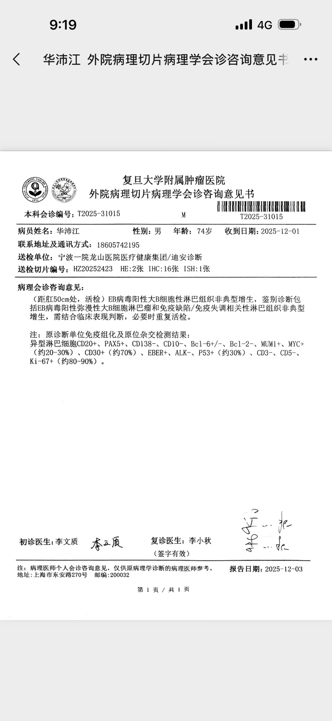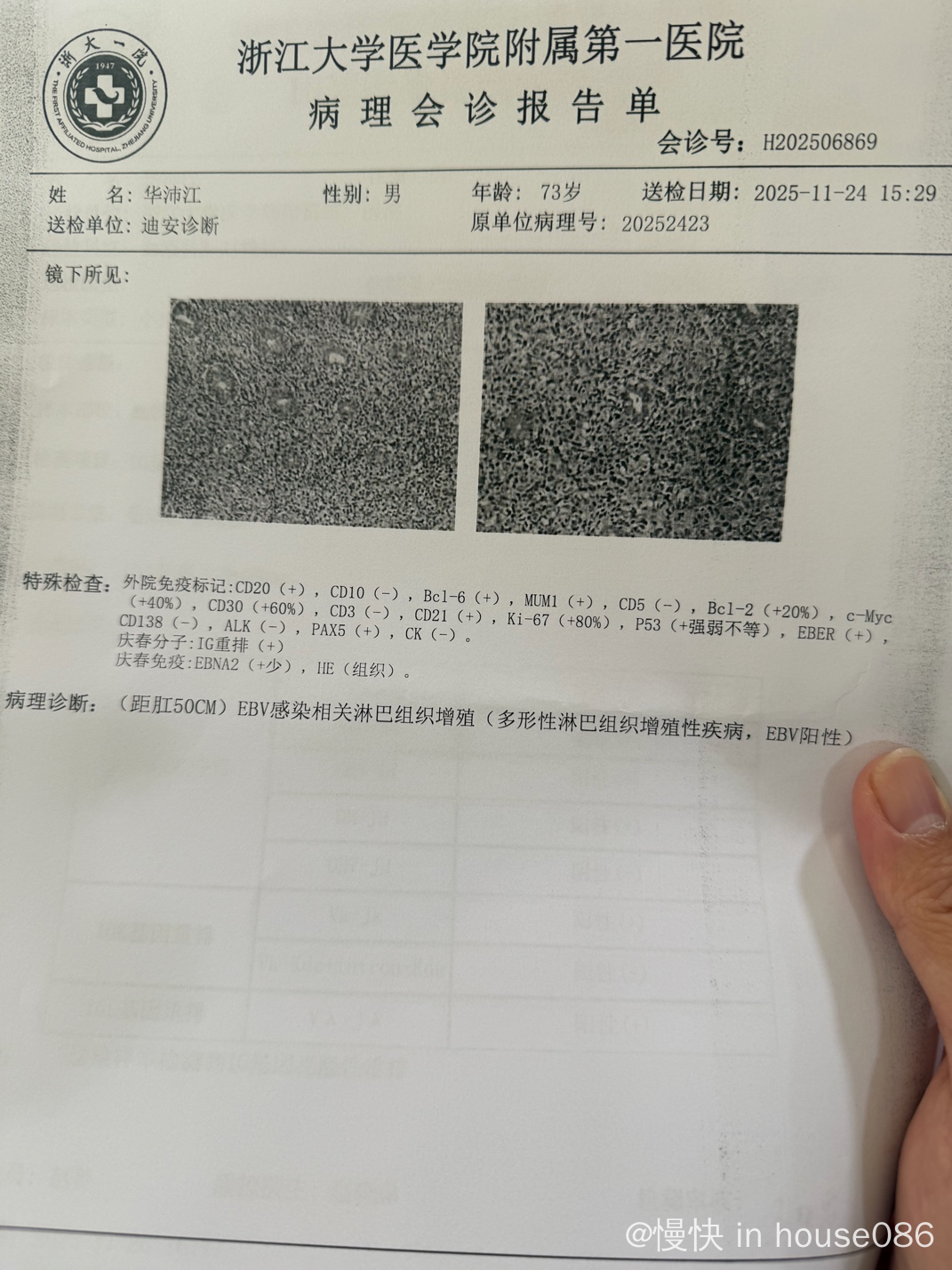 橙色雨丝 发表于 2025-12-23 08:55 Ki67太高,c-Myc过表达,再做病理会诊,并结合PET CT排除EBV阳性弥漫大B细胞淋巴瘤。实际上,多形性EBV阳性淋巴增殖性疾病与EBV阳性大B是有一定重合空间的,在这个空间内的也需要当做弥漫大B来治疗。