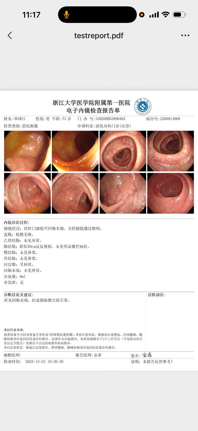 慢快 发表于 2025-12-23 11:25 我们让浙一的专家重新做了一次肠镜,想再做一次活检。报告刚刚出来,好像什么问题都没有,问题消失了,太奇怪了。 是不是可以放心了?