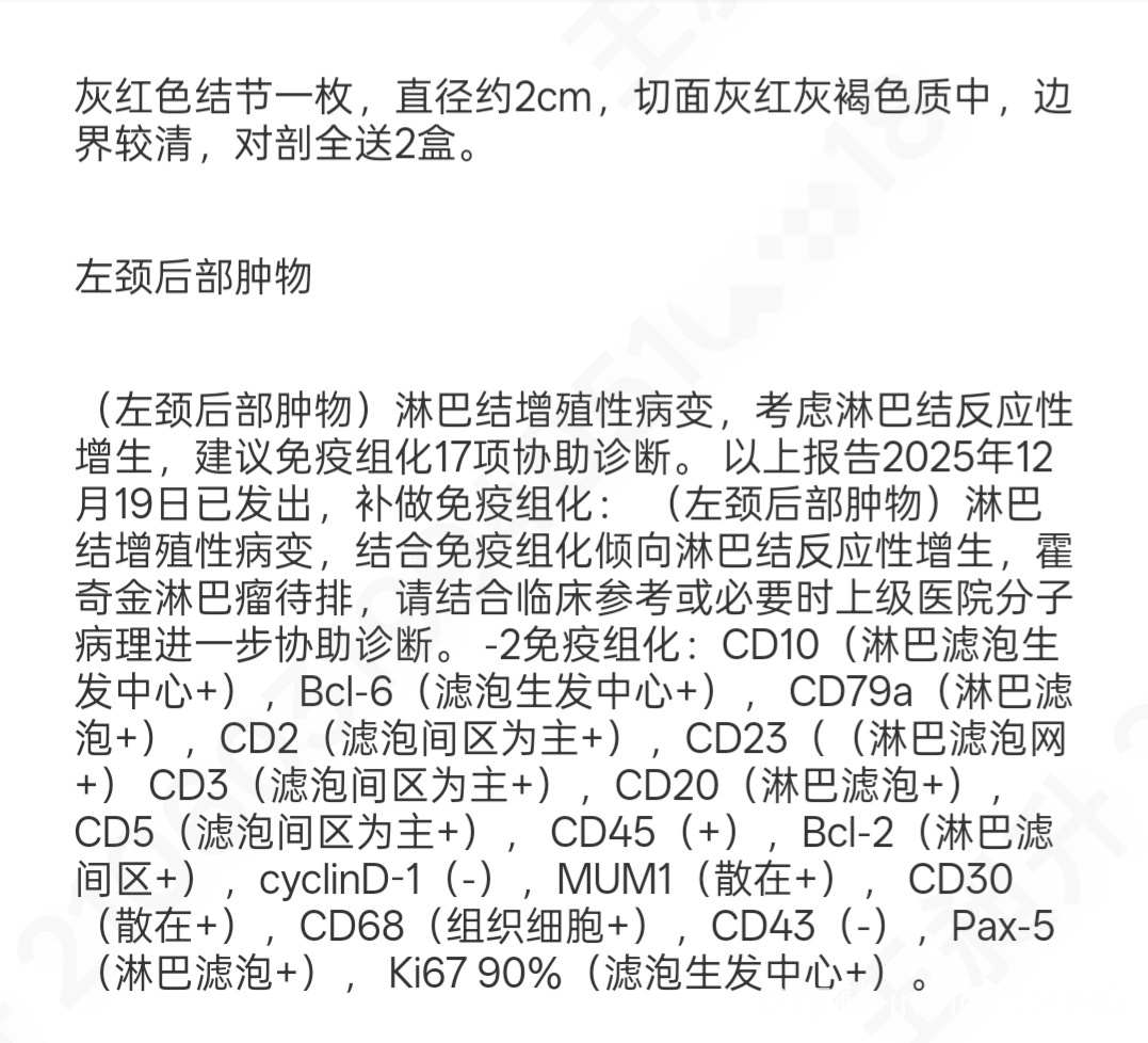 大概是3.4周以前了,发现脖子上淋巴结肿大,后来上网一查说2周不消就要小心了,直接挂的县医院肿瘤科检查,后面又做了活检和鼻咽喉镜,现在在新桥医院等借片分子病理,新桥病理科要周一到周五才上班,现在焦虑等待中。血液检查没特别的异常,就是颈部这么多淋巴结一直这么大。