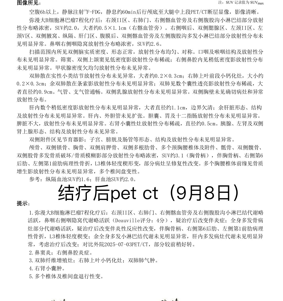我母亲弥漫大B,ipi3分,晚期,非双表达双打击,有肝转骨转,采用Rchop+奥布替尼治疗。