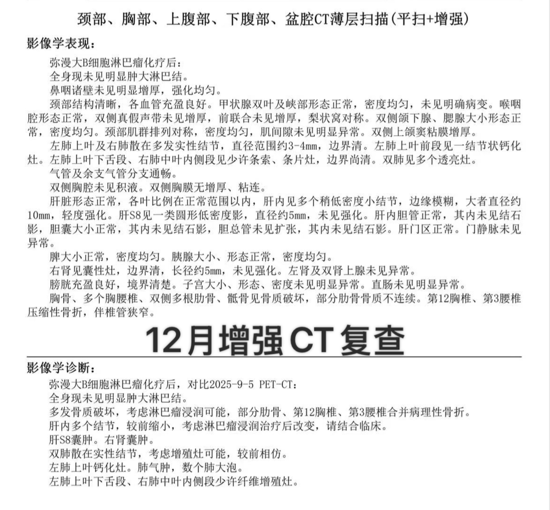 9月份结疗,评分4分,医生说可以继续观察,当时显示的是胸骨柄、右侧第6后肋、左侧第1前肋病理性骨折。12月份复查,做了增强CT,显示的是第12胸椎、第3腰椎合并病理性骨折,伴椎管狭窄,相当于新增了这两处骨折。