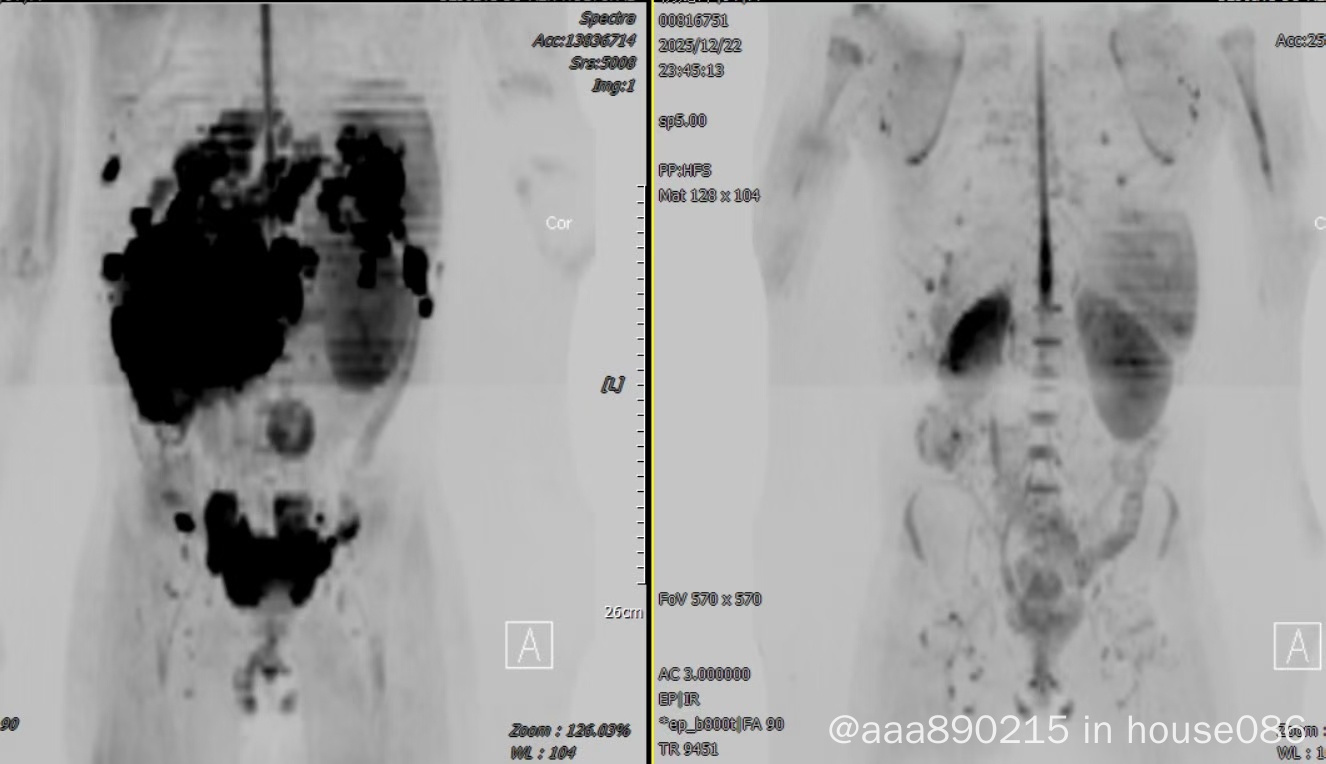 难治复发Burkitt淋巴瘤,治疗半年全面进展,腹部大瘤灶伴胆道及尿路梗阻,带着引流管,经CART续贯治疗完全缓解6个月,这图是这次复查腹部核磁类PET结果,影像科医生说“真是缓解的太好了!”。过去这样难治进展的Burkitt淋巴瘤死亡率高达100%,现在有超过70%的治愈率,真要感谢新治疗技术带来的希望[合十][合十],一直在路上[旺柴][旺柴]