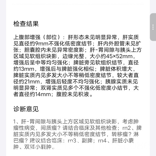 刚刚出了ct结果,医生也说需要病理结果,他怀疑脾脏部分这个不是淋巴瘤,需要外科会诊,我想请问下这种是不是外科直接开刀?如果是我想换个医院,有没有知道脾脏浸润低强化结节➕间质瘤挂哪个科室比较好啊
