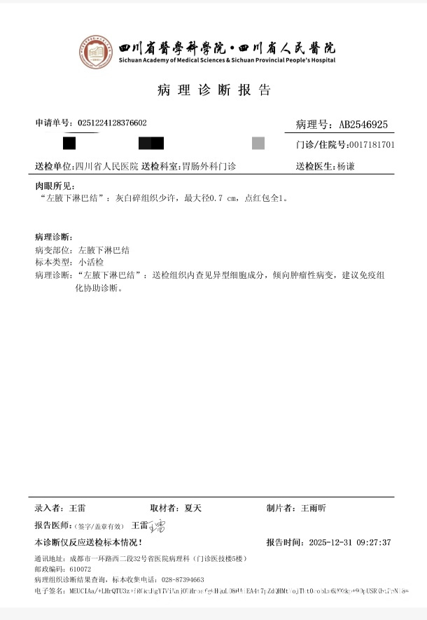 医生触诊怀疑是淋巴瘤,让先做穿刺,现在穿刺结果出来了,有异型细胞,是肿瘤性病变,建议下一步做免疫组化,只有等节后才能去医院预约做免疫组化,请大家看看还有良性的可能吗?