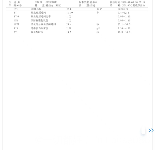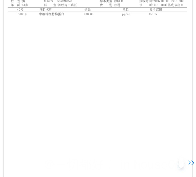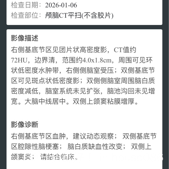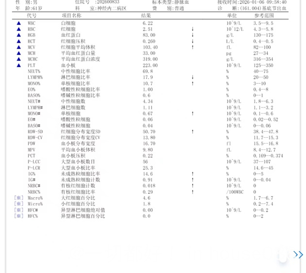 刚开始生化报告没出来时候,不敢给做头部增强MRI,说是做检查打的那个针对肾脏会比较大的影响。后来血液科大夫会诊说,先把脑出血解决了,不要来回折腾病人了,后面再说,哎