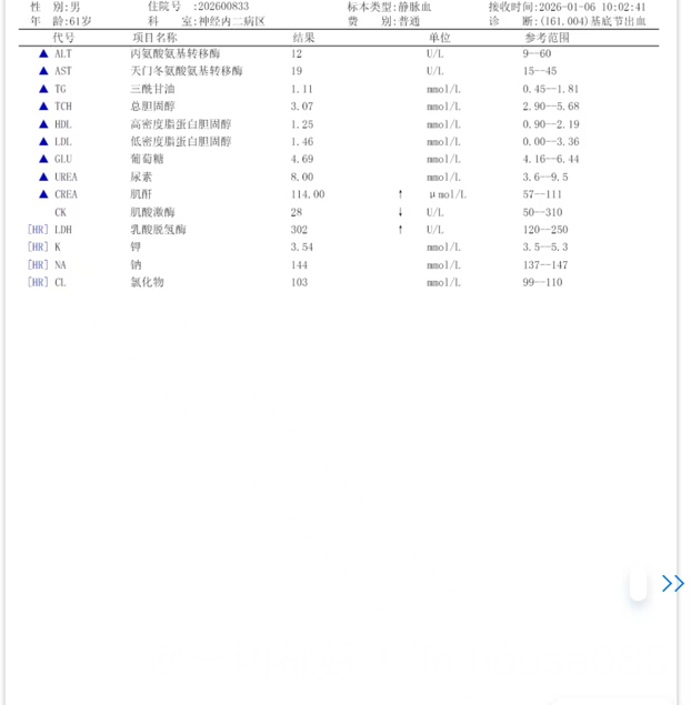 本来打算9号去北京进行第六次化疗,今天早上突然一侧身体无力,说话大舌头,有一点嘴歪,赶紧到急诊拍了脑部ct,检查有轻微脑出血。现在神经内科住院,神内大夫让把泽布替尼暂时停了,化疗也推迟了。11月26号做的petct 显示病灶完全消失,cmr ,这几次包括12月19号做的腰穿也无异常,现在肾功能肌酐有点高,大夫不敢给做增强头部MRI,担心影响肾脏,还有什么办法能够排除复发吗?
