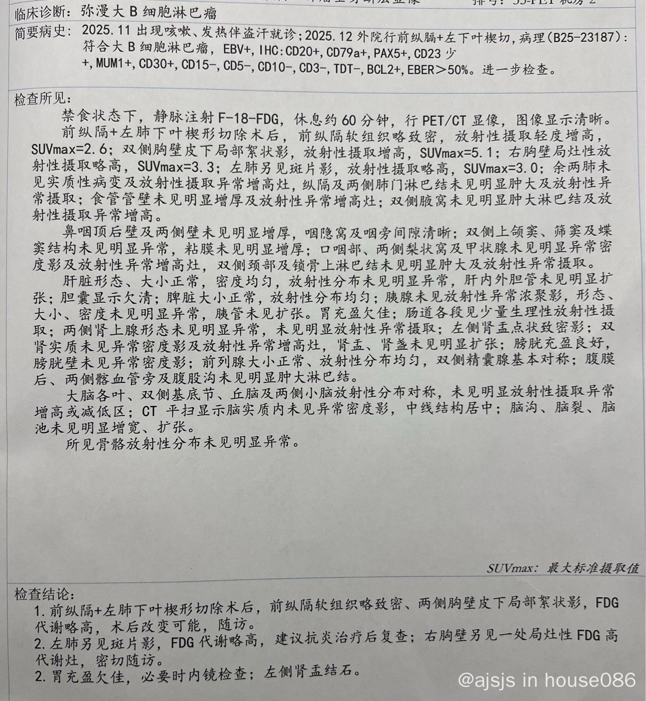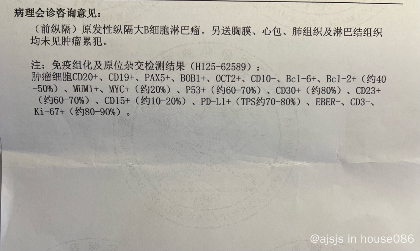 原发纵膈大B,男性、LDH大于正常值两倍、结外器官侵犯,III/IV期,是主要的不良预后因素,现在有其中两项,但主要病灶已切除,所以R-CHOP或DA-EPOCH-R都可以。如果决定采用前者的话,建议与医生商量加入PD-1单抗。