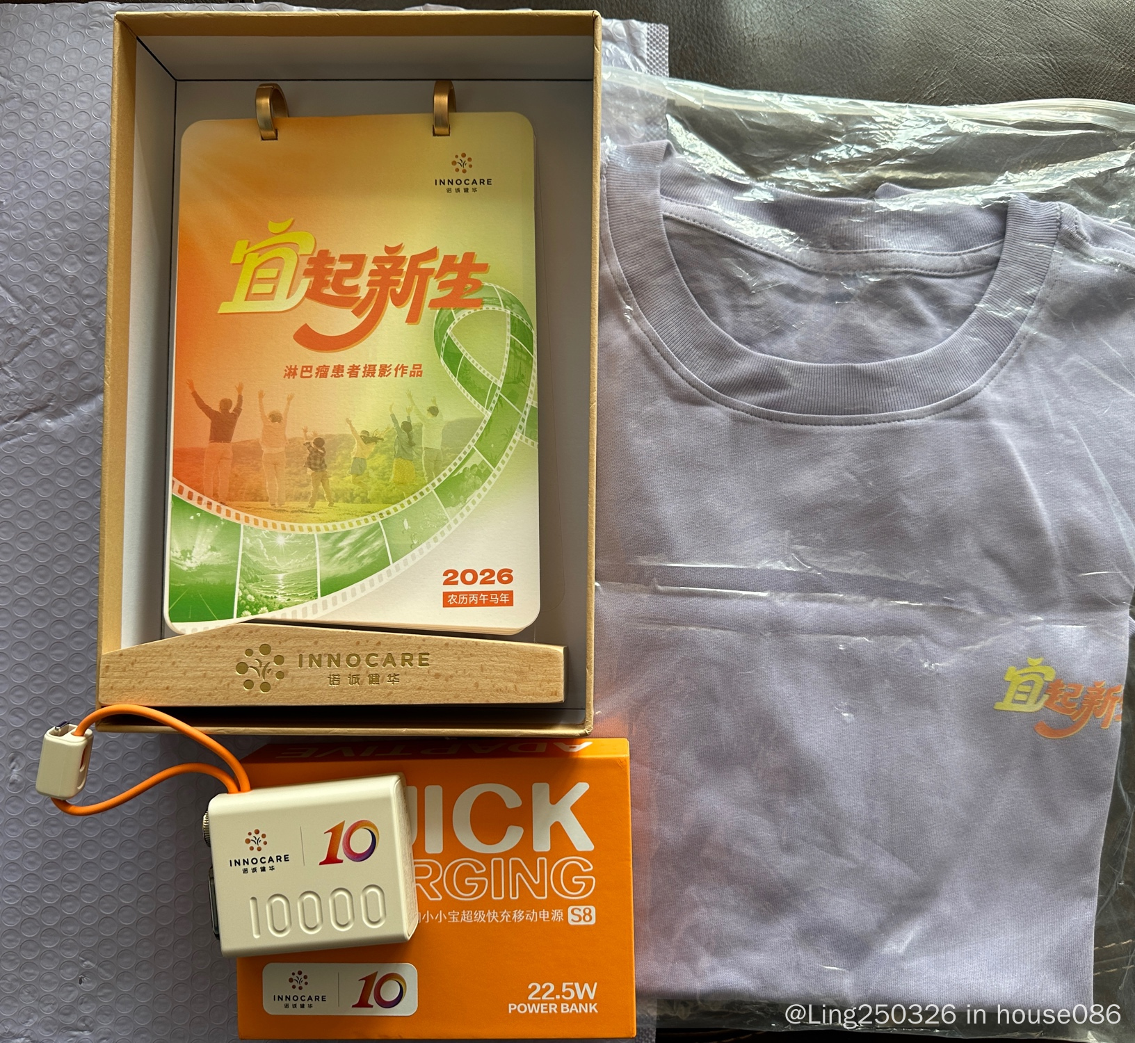 收到淋巴瘤之家的暖心礼物啦——“宜起新生”T恤、摄影台历和纪念奖充电宝,每一份都藏着爱与力量。