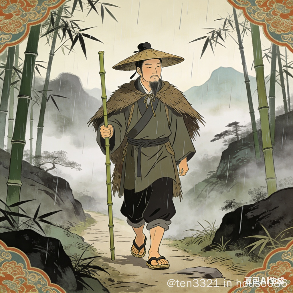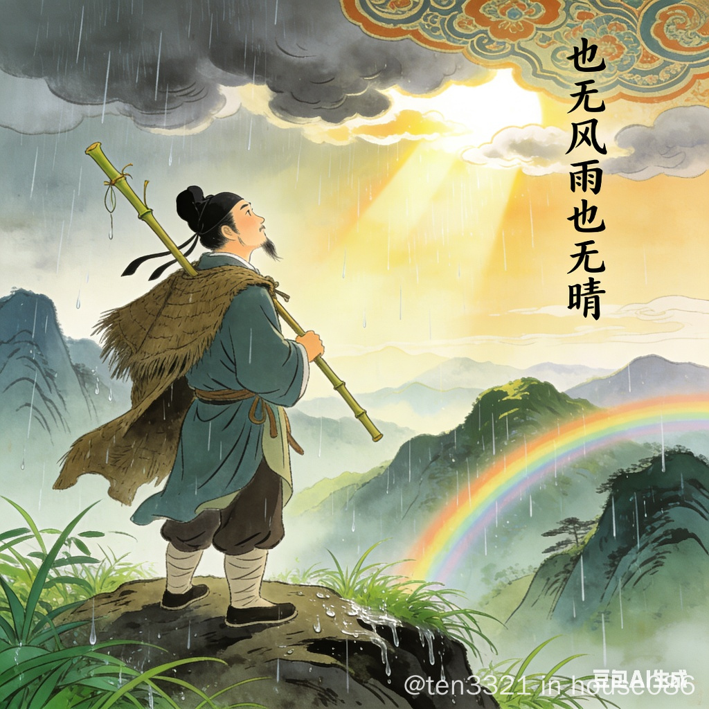 莫听穿林打叶声,何妨吟啸且徐行。竹杖芒鞋轻胜马,谁怕?一蓑烟雨任平生。