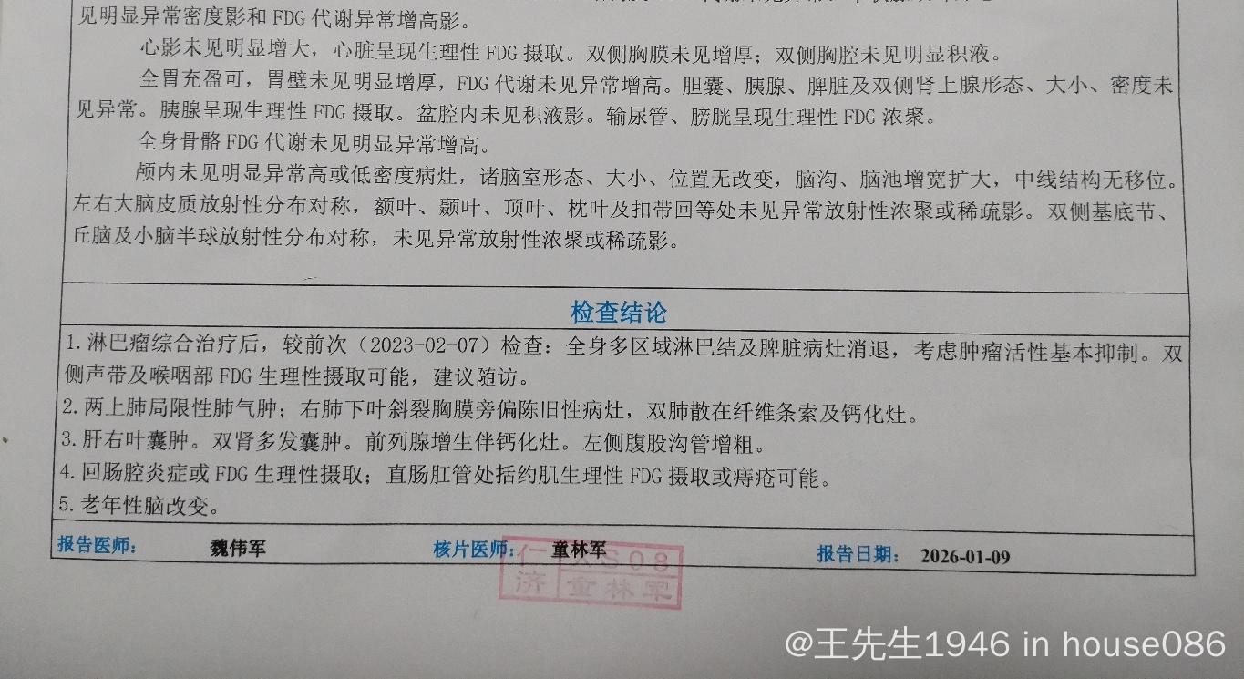 元月2日在仁济西院血液科日间病房行第4周硼替佐米靶向药,等辅助用药后,理应通知我登记下次东院入院第4次化疗事宜,但医生却叫我预约我的主任医生的专家门诊我如期就诊,说要改方案,叫我一定要做一次pet/ct我最反感做pet不仅弗钱而且伤身,我要求做增强ct也不行,只好勉强同意做了。今天pet/ct报告出来了让我喜出开外因为检查结论说我病灶之处是生理性摄取可能!建议随访。我觉得这次做pet的钱化得一点也不冤!