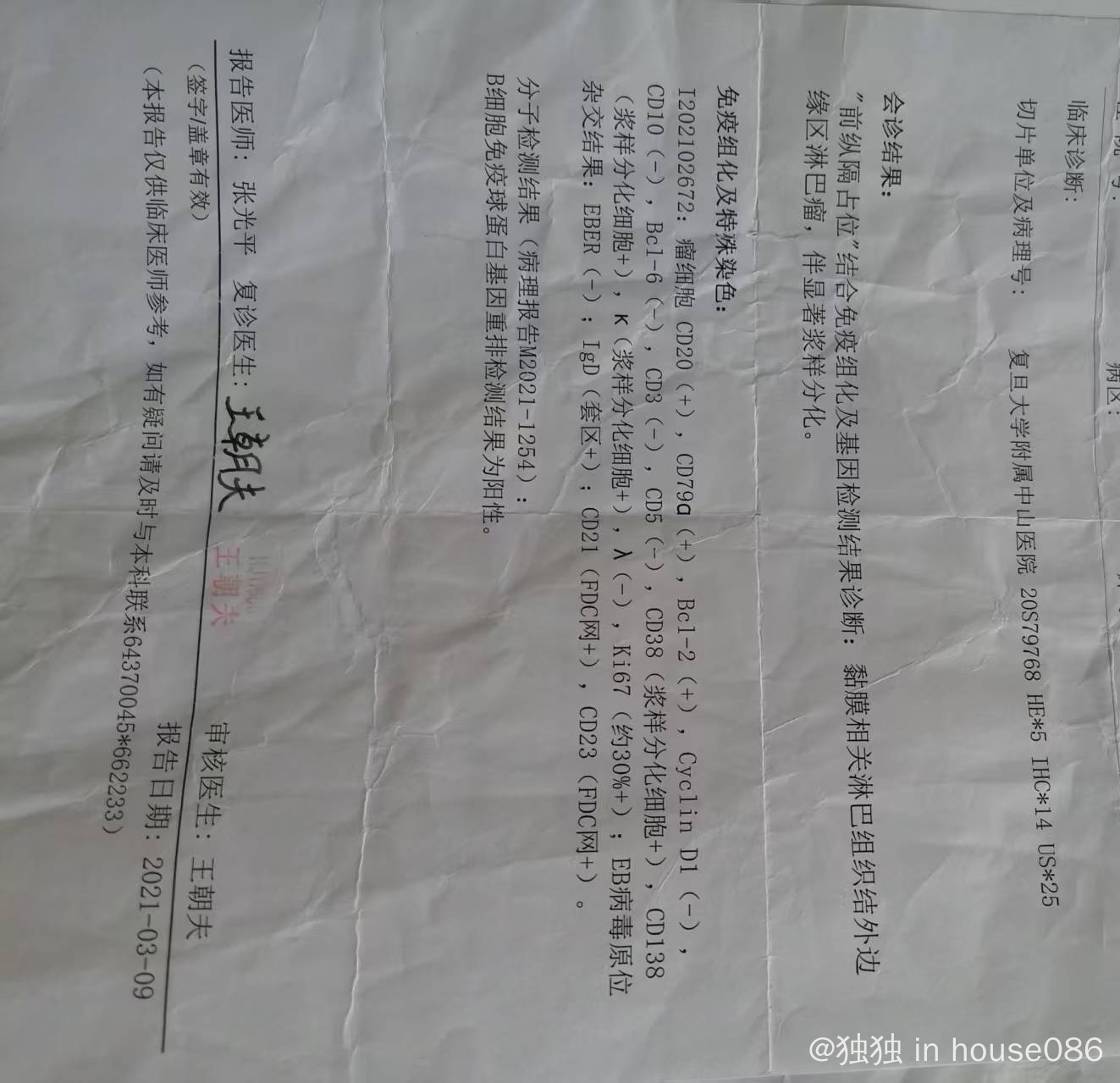 病理报告黏膜相关边缘带B细胞淋巴瘤/malt淋巴瘤