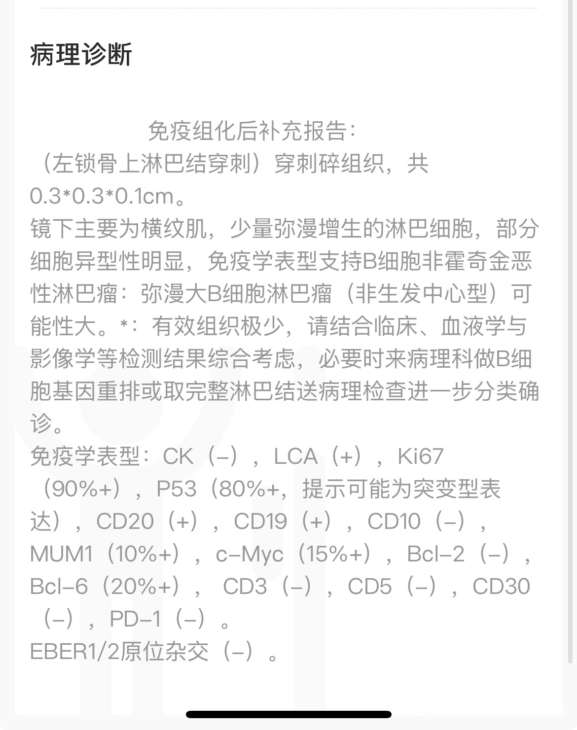 爸爸今天免疫组化结果出来,因为这几天看了好几个医生确诊淋巴瘤已经有准备,但是因为病理组织太少,想请问病友/家属们,这种情况误诊风险率大吗?下周一准备从湘雅转到省肿瘤入院,是借切片继续分型还是重新活检取组织更好?感谢大家