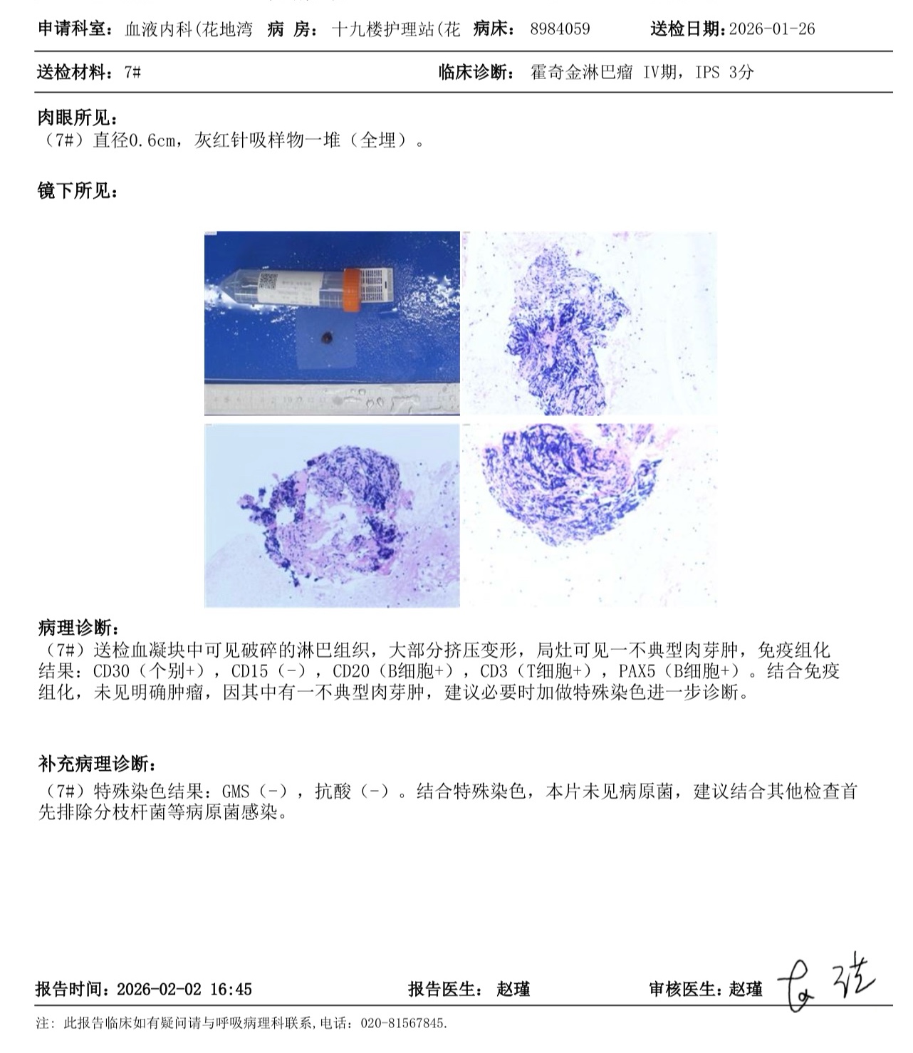 白衣少女吃汤圆 发表于 2026-01-30 15:56 雨丝大大,取纵隔7组高代谢淋巴结,病理报告:未见肿瘤细胞,见一肉芽肿。加做组化染色予以明确。