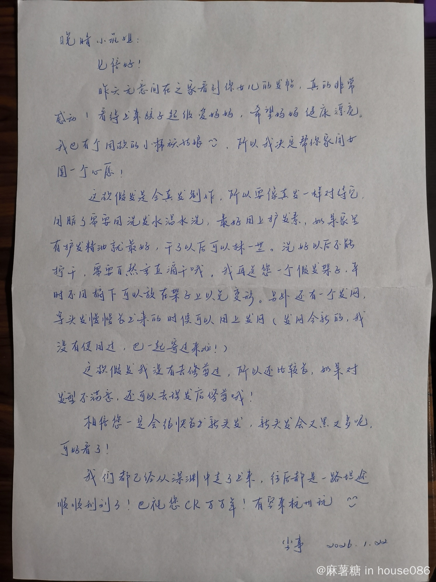 收到的不仅是一顶全真发的假发,更把您走过这段路的勇气和温柔,都传递给了我。您信里写的那些洗护细节,我都记在心里了。我一定会好好爱护它,带着您的祝福,有着漂亮的发型,想想哪哪都开心~我也会把这份温暖传递下去嘀~