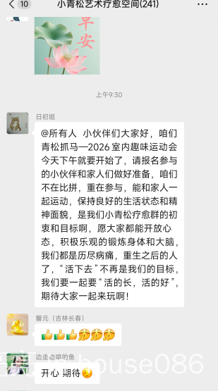 今天我们在淋巴瘤之家“小青松艺术疗愈空间”云端会议室相聚,举办了一场别开生面的“青松抓马——2026室内趣味运动会”。在这里只有病友更懂你,我们“不在比拼,重在参与”。作为历尽病痛、重生之后的人,我们要一起“活得长,活得好”!
