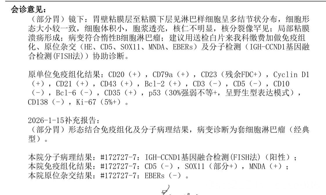 本院分子病理结果:#172727-7:IGH-CCND1基因融合检测(FISH法)(阳性);