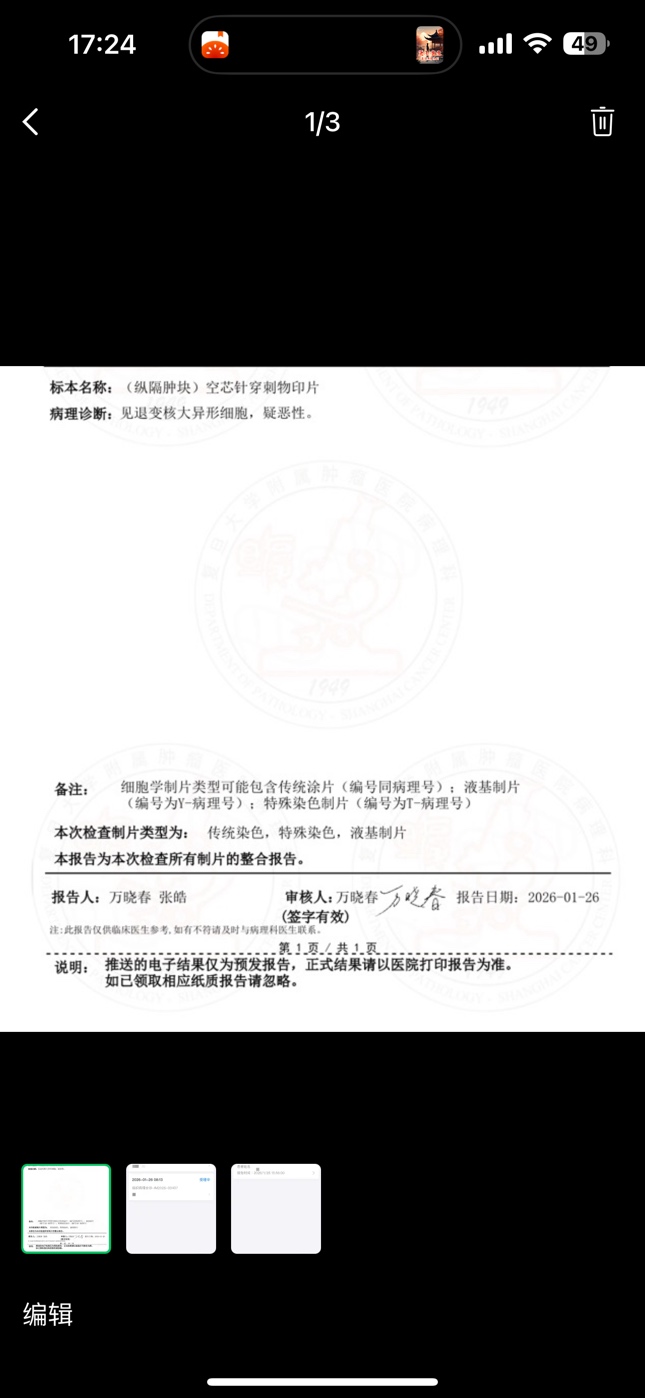 之前第一次穿刺没穿到确诊细胞,只能怀疑是霍奇金,上周又在上肿重新做了穿刺,然后昨天查到了初步的细胞病理报告