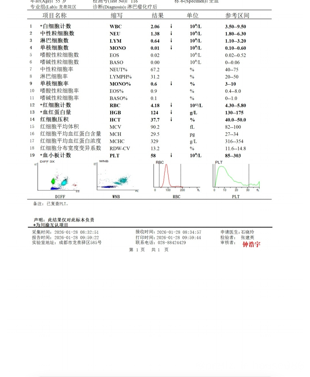 - 白细胞(WBC:2.06×10⁹/L)、中性粒细胞(NEU:1.38×10⁹/L)、淋巴细胞(LYM:0.64×10⁹/L)、单核细胞(MONO:0.01×10⁹/L):均低于正常范围,提示化疗后骨髓抑制(白细胞减少),免疫力会暂时下降,容易感染。