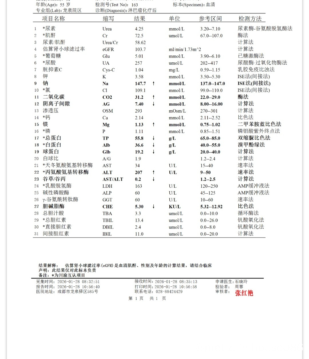 - 丙氨酸氨基转移酶(ALT:207U/L):显著升高(正常9~50),提示肝功能损伤,是化疗药物常见的副作用之一。