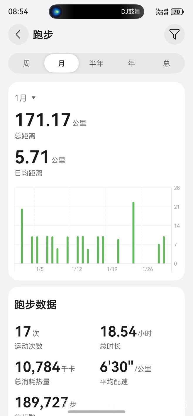 1月份运动跑量在今晚完成夜跑10公里圆满收官!累计171公里,汗水浇过路,脚步丈量热爱,下一月继续向前冲!