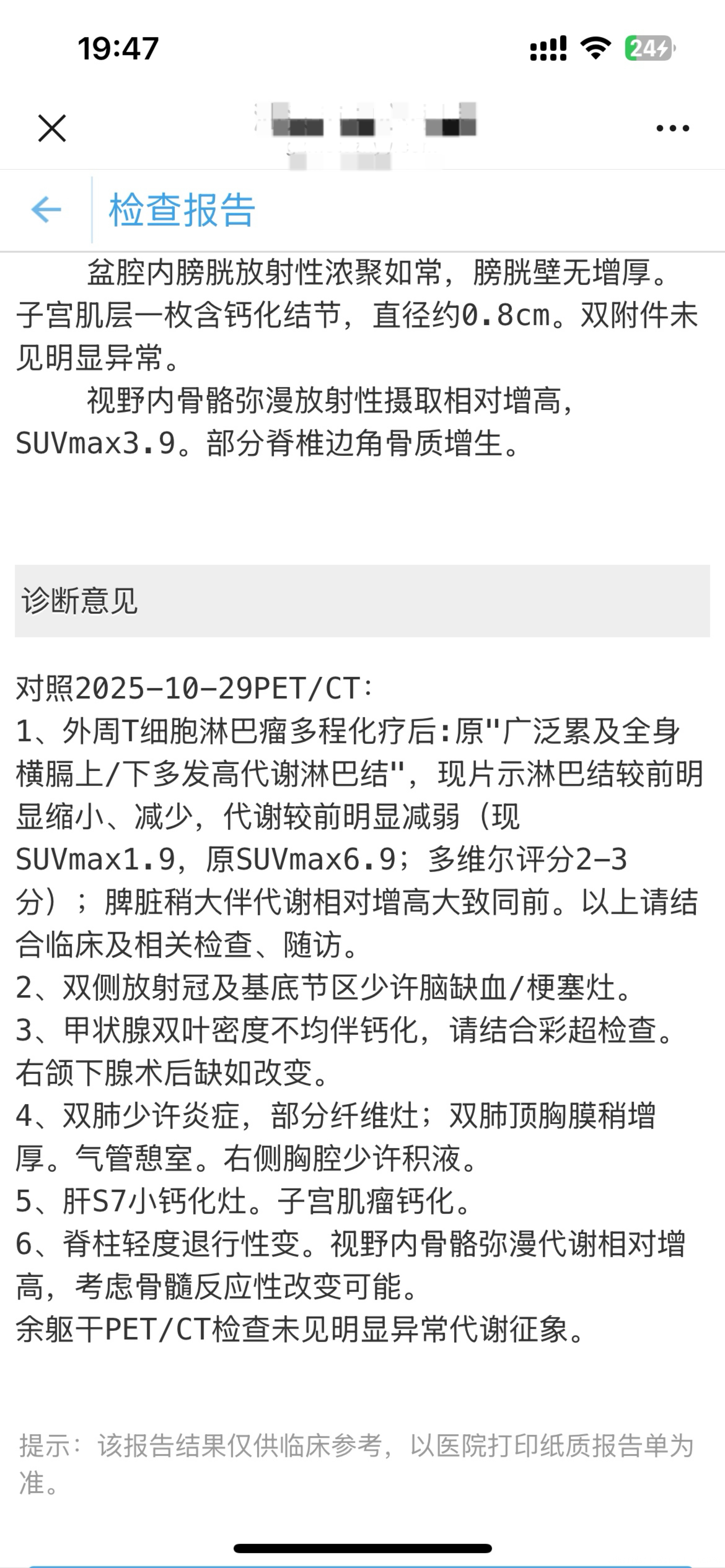 4次化疗chop方案+3个疗程的西达本胺(因为反应太大减量到4颗/次),petct复查疗效很好,多维评分2-3分,但仍然有肝脾稍大代谢高,双肺少许炎症等问题。
