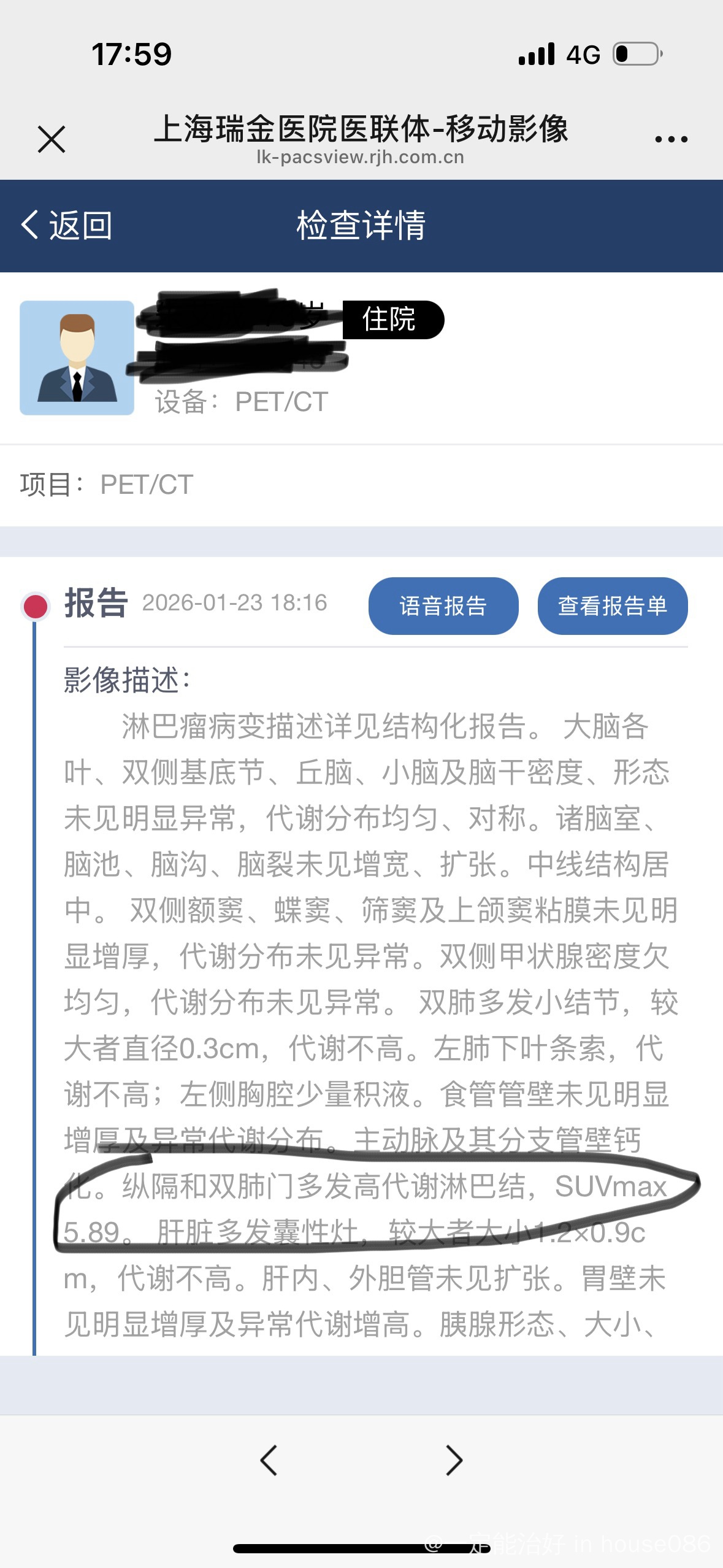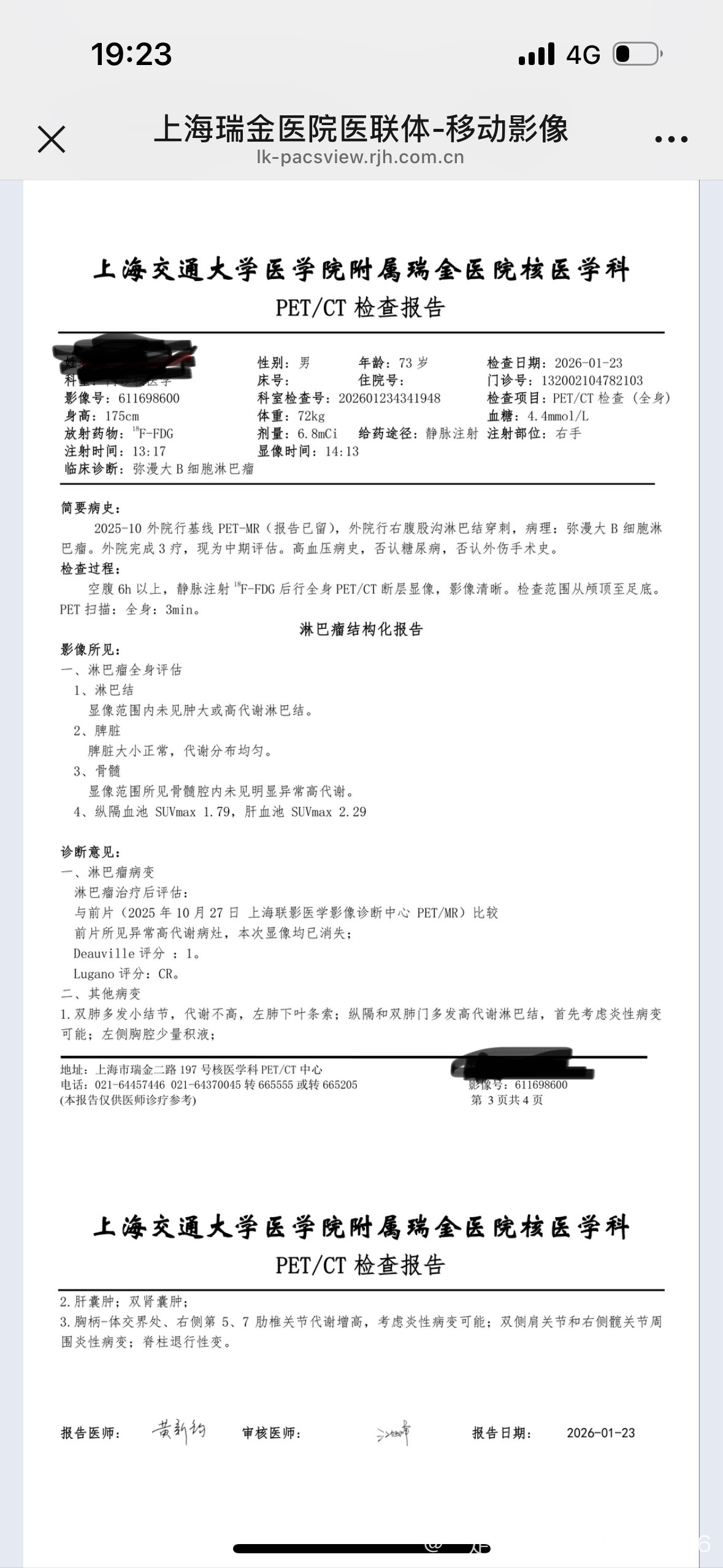 3疗后PETCT Cr 1分 非常棒,但是报告上又写着纵隔和双肺门多发高代谢淋巴结 SUV 5.8 首先考虑炎性改变可能,本来我觉的没啥 后来想起发病时他最高代谢值也只有7.4 不由的紧张起来 这到底是新的炎性症状还是肿瘤活性啊?现在四疗结束一周了 今天抽血LDH 800多 比之前几疗后都要高,我爸76 是非生发CD 5阳性,方案是pola +利妥昔+来那+匹妥布。各位有碰到这情况的么