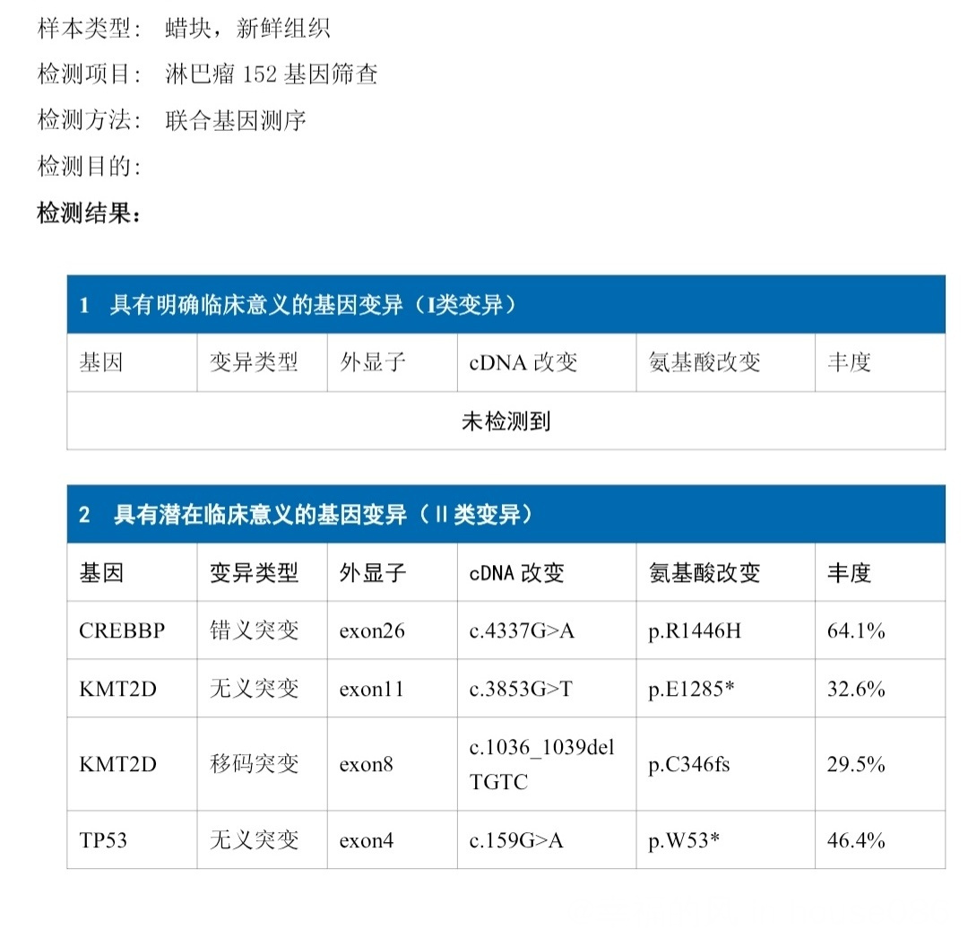 1 基因测序 46.4% 表明主克隆存在 TP53 单等位无义突变(c.159G>A, p.W53*),此突变无义突变导致 p53 蛋白缺失/不稳定