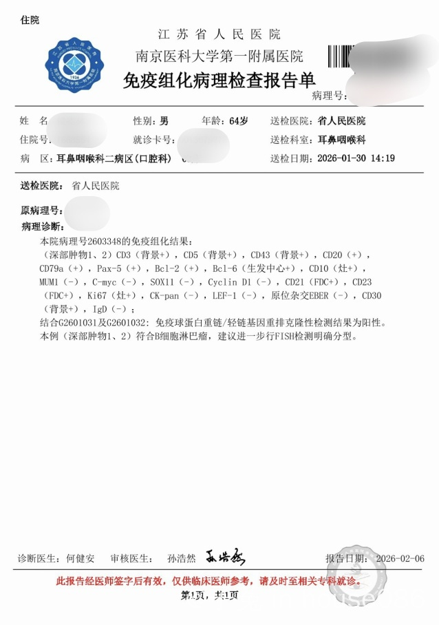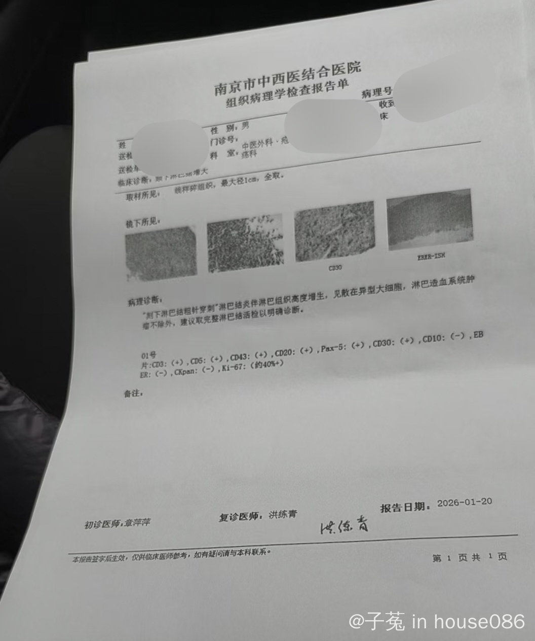 是直接做的淋巴结活检,目前出了免疫组化和分子病理,和之前粗穿的结果好像不一样