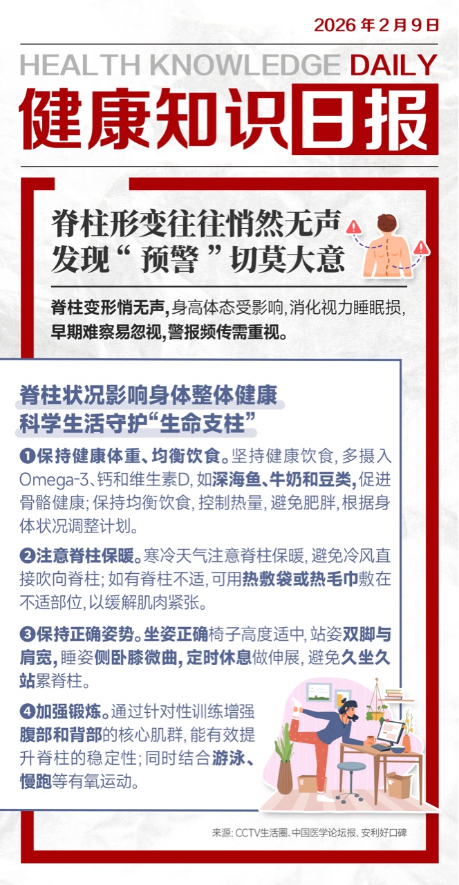脊柱健康涉及身体多个器官,日常坚持健康生活方式,发现脊柱“预警”切勿拖延,关注脊柱健康安享幸福生活。