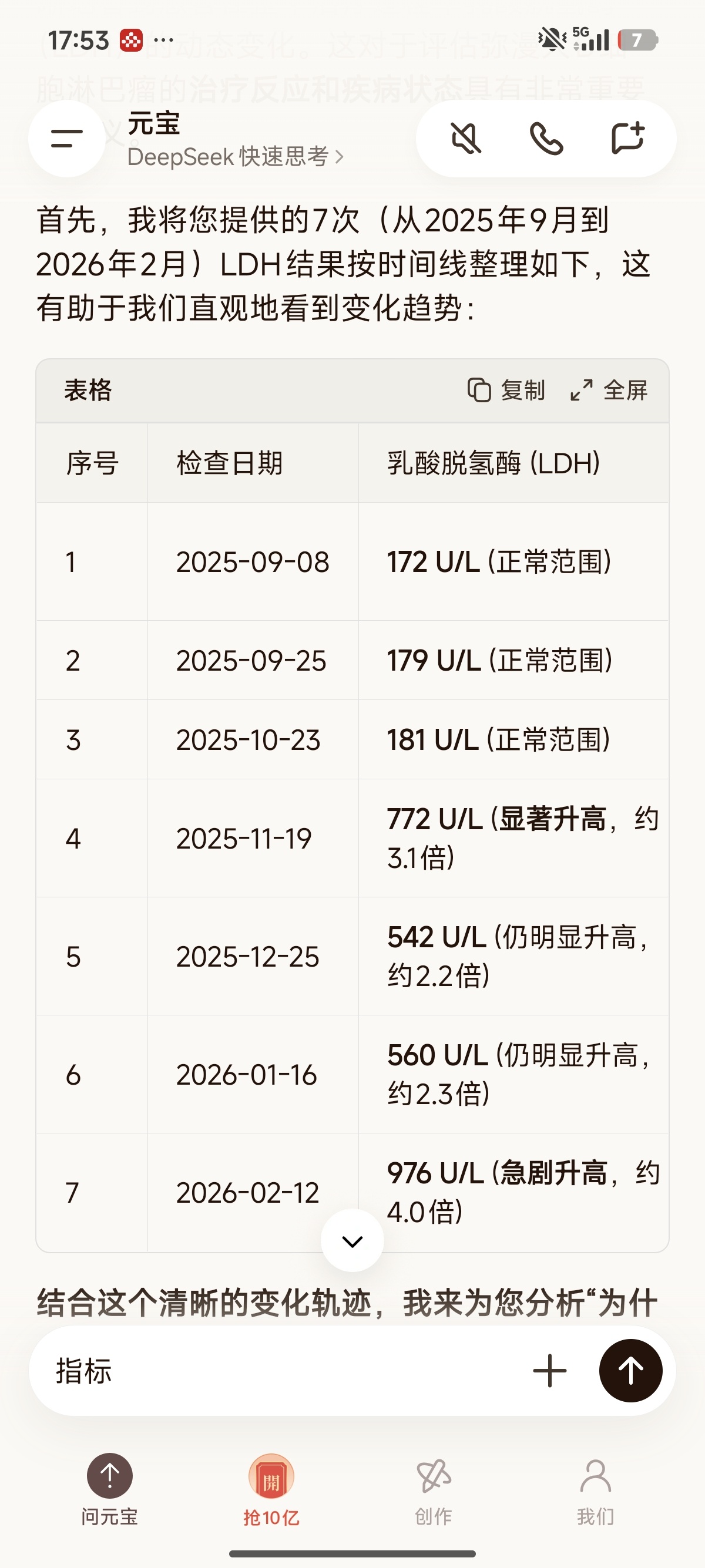 我们前三个疗程化疗前抽血检查乳酸脱氢酶基本都是170-180这个区间,到第4疗程开始前抽血700多,5、6疗程后变成500多,但是第7个疗程现在900多近1000,这个指标感觉很高了搞得我有点焦虑了,肝肾功能看指标都没什么大问题,用的是pola r chp方案,6+2r,这次是准备去打r的,结果上药之前发现乳酸脱氢酶好高,想问一下这个指标有影响吗?