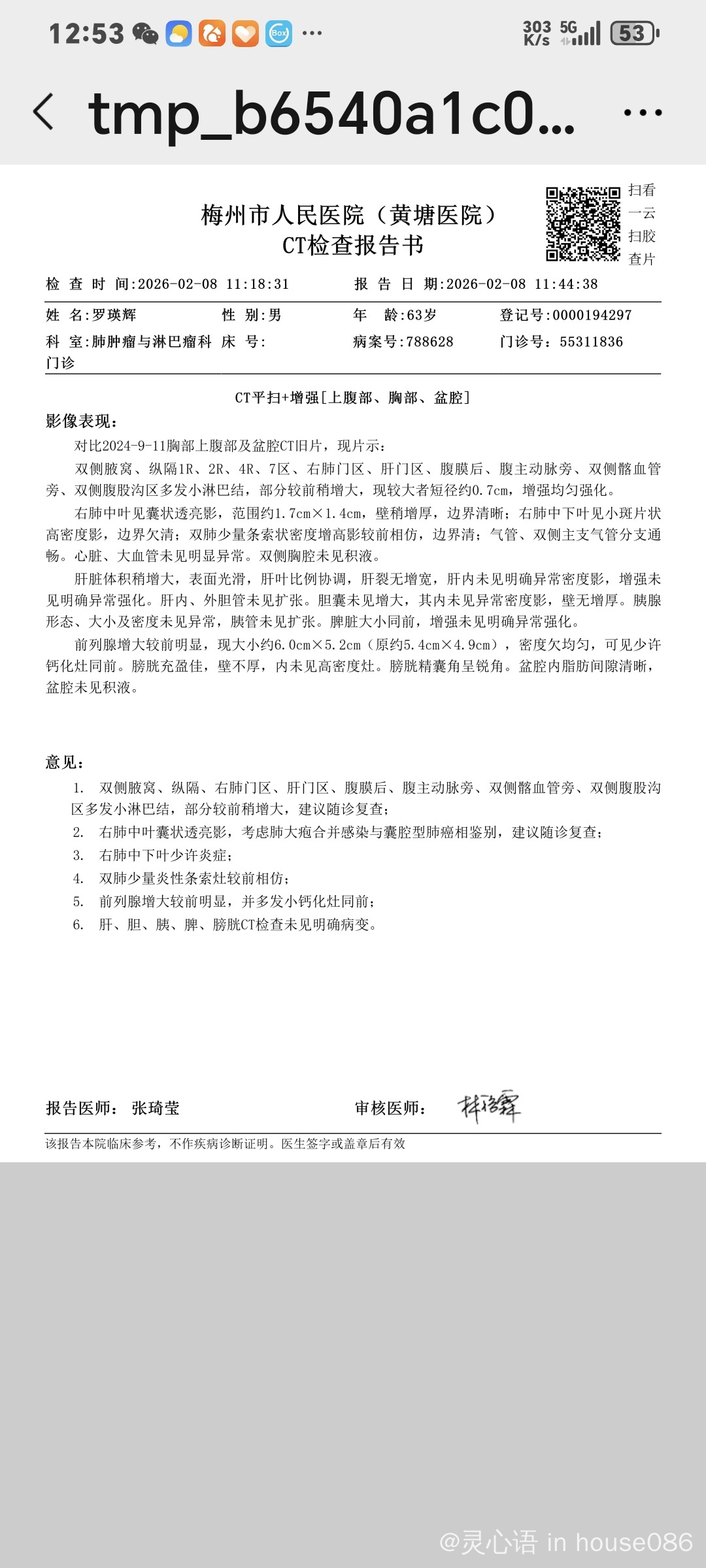 我是脾边缘淋巴瘤康复8年的患者,2月8日做个增强CT和B超复查,CT显示淋巴结增大,大者约0.7cm,右肺中叶见囊状透量影,1.7X1.4cm,请@洪帮主,@橙色雨丝和各位战友帮我看看,是否淋巴瘤复发了?这1.7x1.4Cm的是否肺癌的表现,接下来怎么办?是否再做个Petct再复查?谢谢大家!