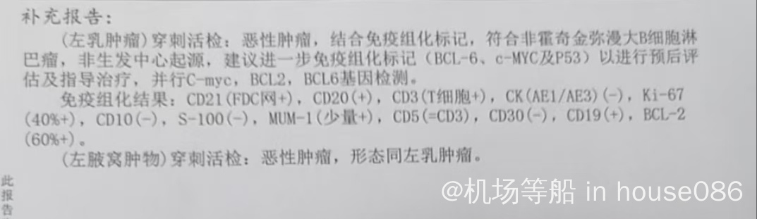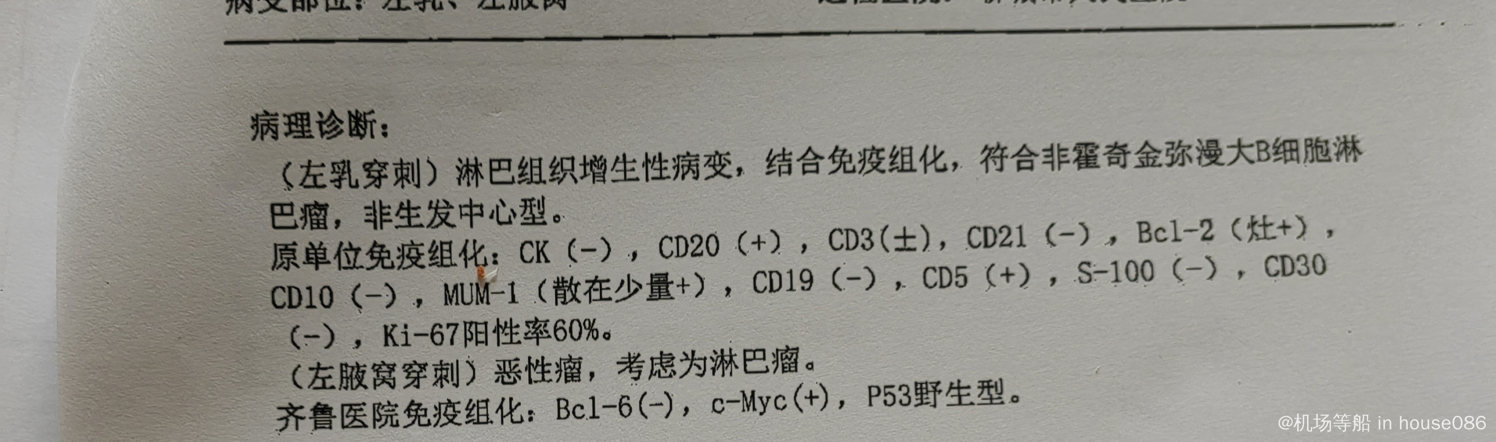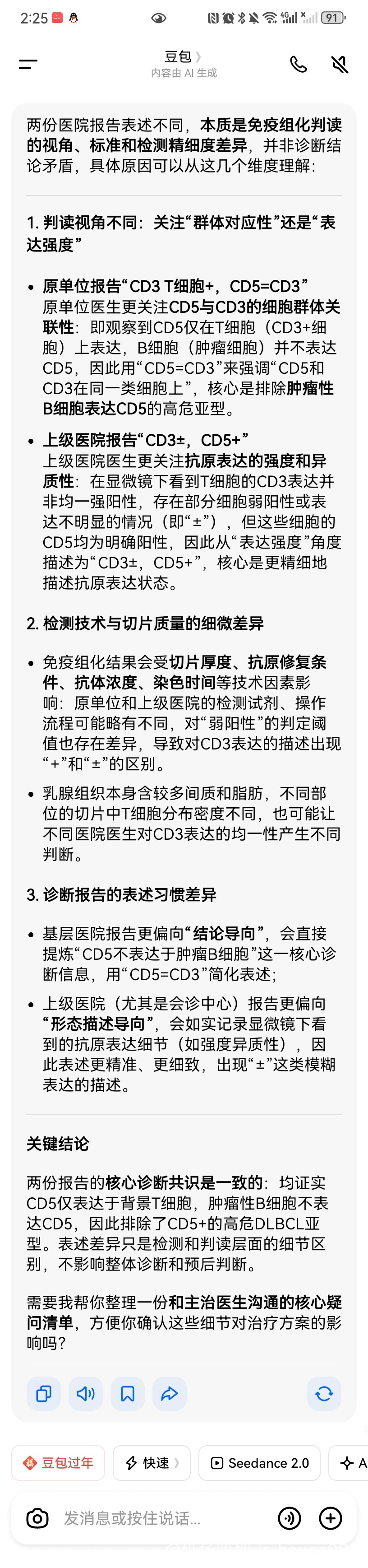 上级医院的免疫组化是:cd3±,cd5+,bcl-2灶+,原单位医院免疫组化是:cd3T细胞+,cd5=cd3,bcl-2 60%+。如果按照原单位是非中高危亚型且双表达,如果按照上级单位,就是非双表达且中高危亚型。