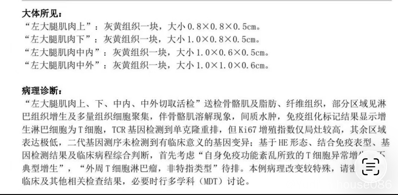 本人2年前出现眼袋肿大 白细胞计数降低 24年底petct发现腰部、臀部、面颊处多处骨骼肌高代谢 多次活检均未能明确是否为淋巴瘤,但是浸润细胞为cd8+阳性细胞毒细胞,肌肉内并未找到任何基因突变。血检发现肌酸激酶,ldh明显升高,细胞因子严重超标,gamma干扰素超标20倍