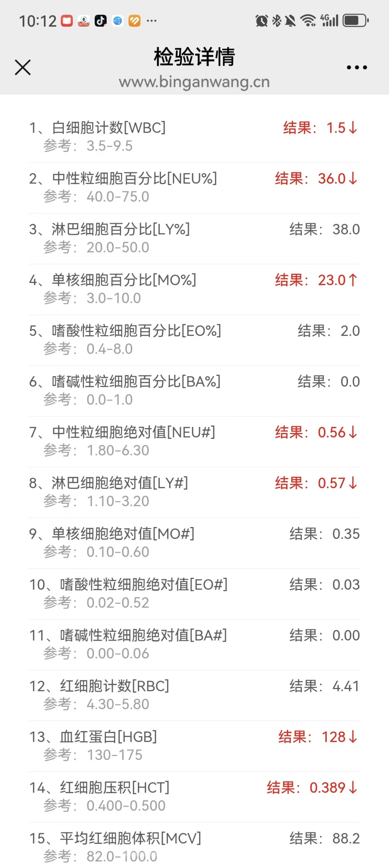 一疗后第10天白细胞 4.3 中性细胞4  今天第16天验血白细胞1.5 中性细胞0.56了 按理说应该升的啊 这下降能不能跟前两天痔疮出血有关 医生让打短效升白 @橙色雨丝 大神这突然降有什么原因嘛