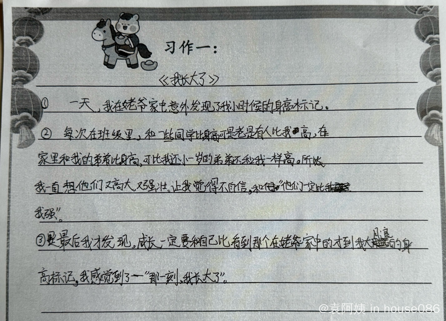 前几天,十岁的外孙小树一人猫在书房中写作文,大约半个小时的功夫,他笑眯眯的走了出来。我问:作文写完了吗?姥姥可以看看吗?他回答:可以。