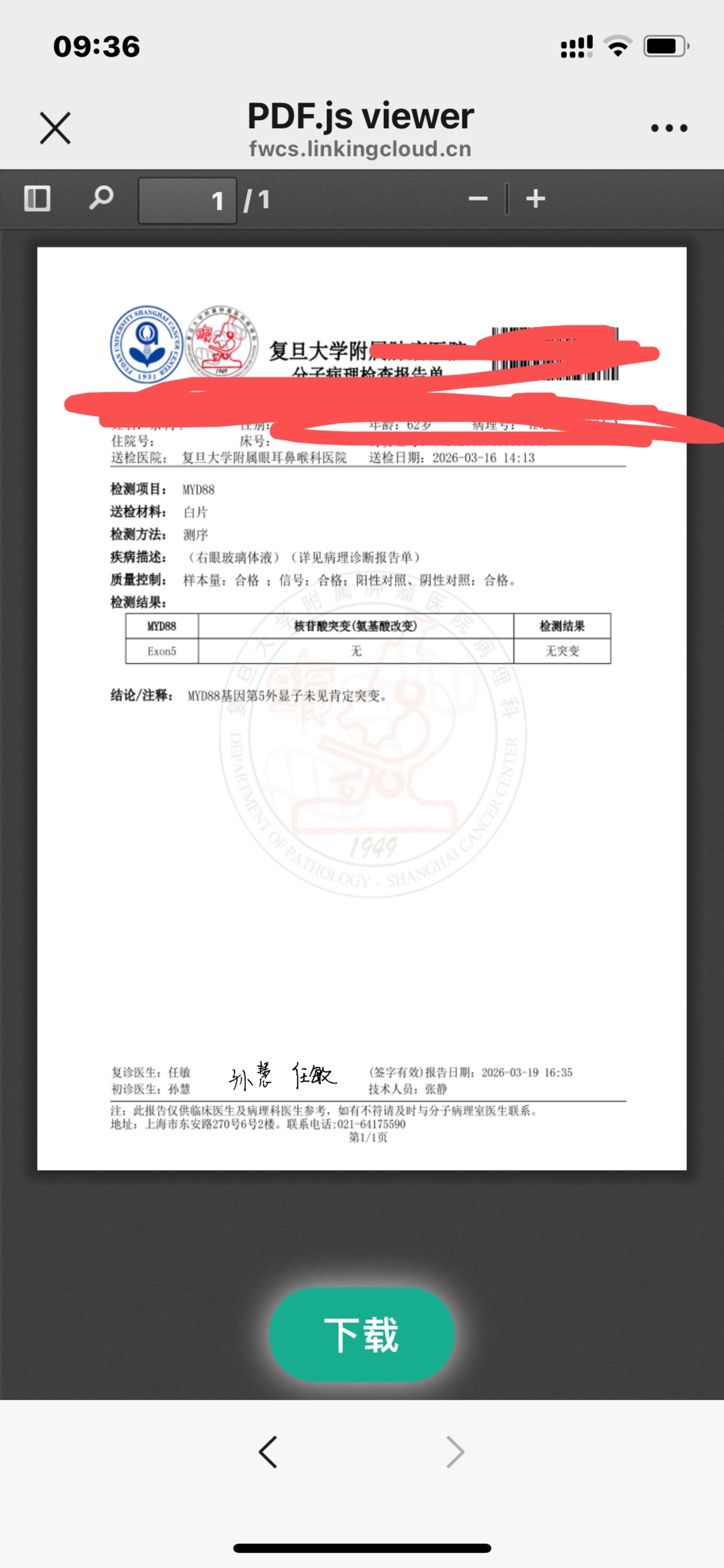 淋巴瘤细胞分泌IL-10,炎症细胞分泌IL-6。房水中IL-10大于50 pg/L、玻璃体液中IL-10大于400 pg/L或IL-10/IL-6比值>1,对诊断玻璃体视网膜淋巴瘤有意义。还可以对玻璃体样本做MYD88突变的检查。 |
