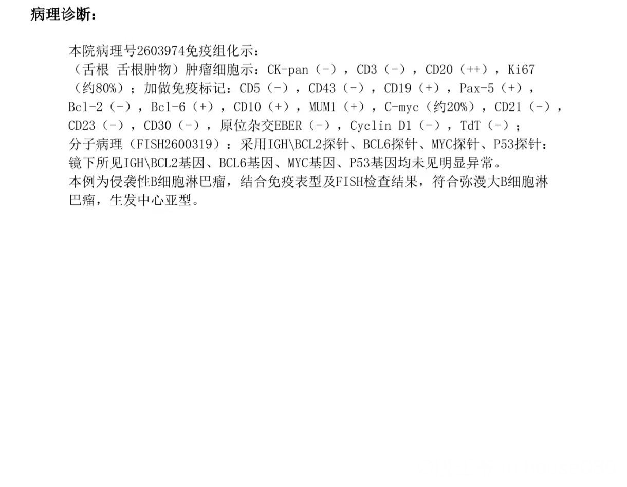 FISH套餐中应该把TP53改为IRF4,因为TP53缺失对大B的预后没有影响,做这个没有什么意义,而发生在韦氏环的淋巴瘤有很大一部分是伴IRF4重排的大B,这种类型预后相对来说较好。